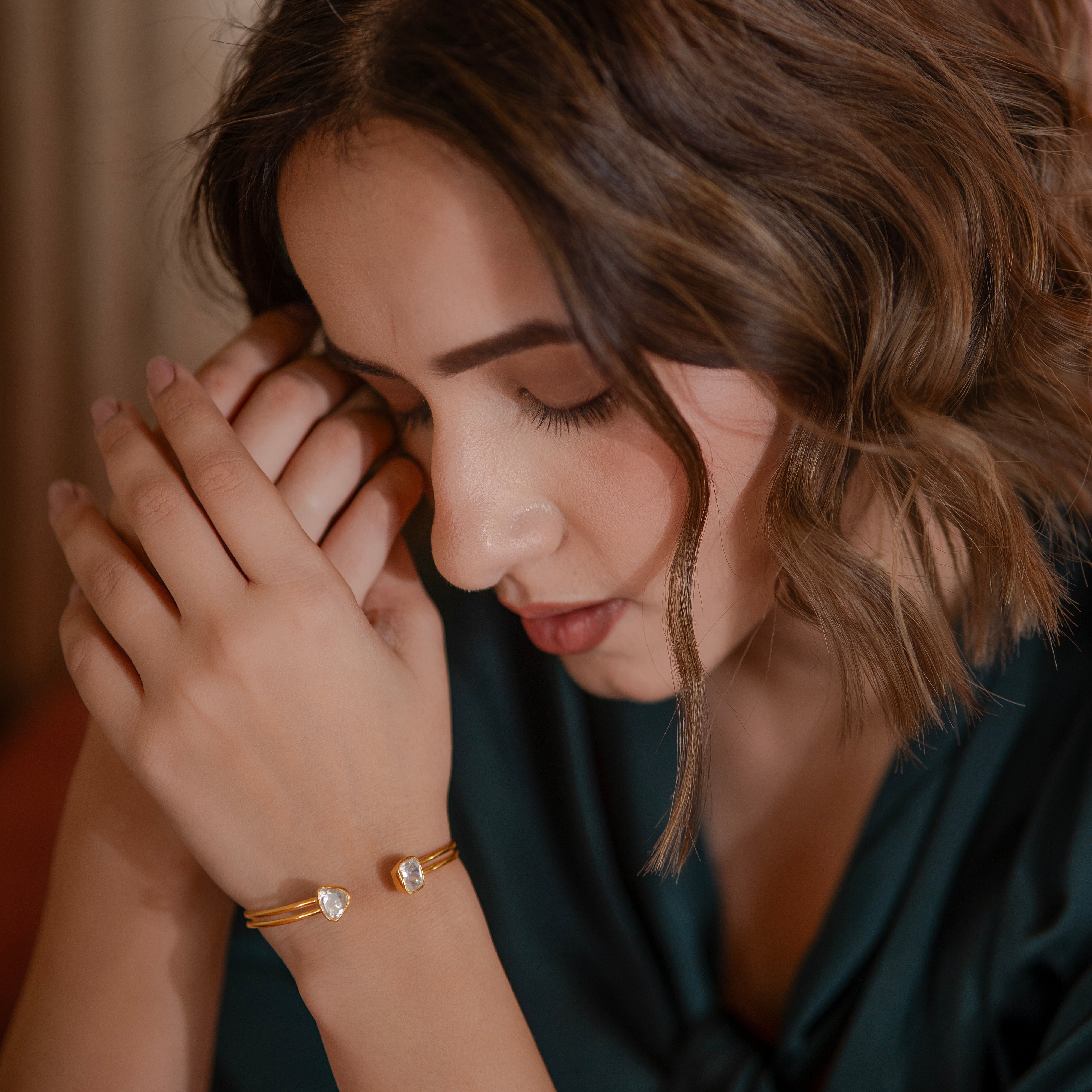 Inspired by the timeless charm of polki, POLiNA brings old-world elegance into modern, wearable silhouettes. Featuring uncut moissanite stones handcrafted in 925 sterling silver and finished with 18K gold plating, each piece is designed to shine from day to night - effortlessly, enduringly, and undeniably Hyperbole.