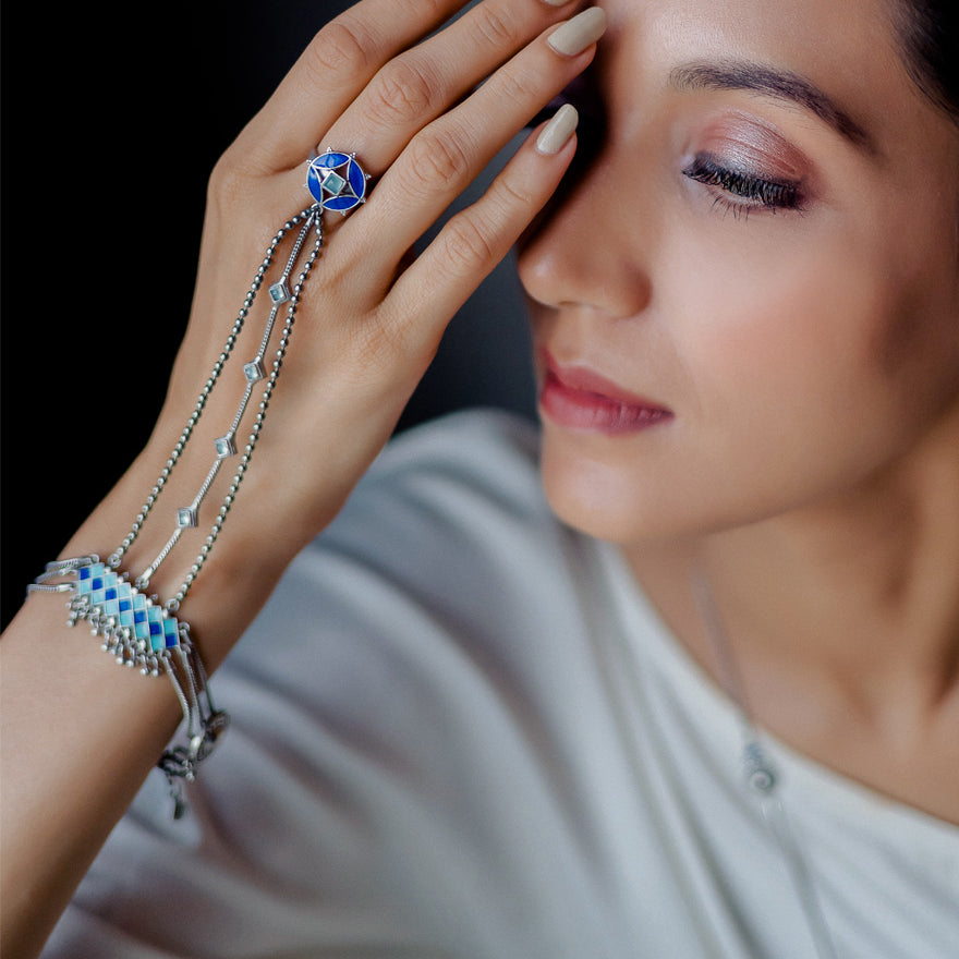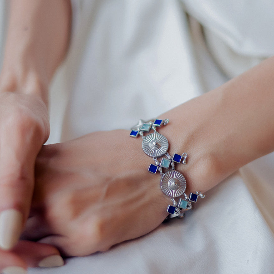 Explore Marrakech collection: fusion of Moroccan aesthetics & contemporary silver designs. Handcrafted by skilled artisans, each piece showcases vibrant semiprecious stones & hand-painted enamel. Immerse yourself in the colors & details of Marrakech's architecture with every wear.