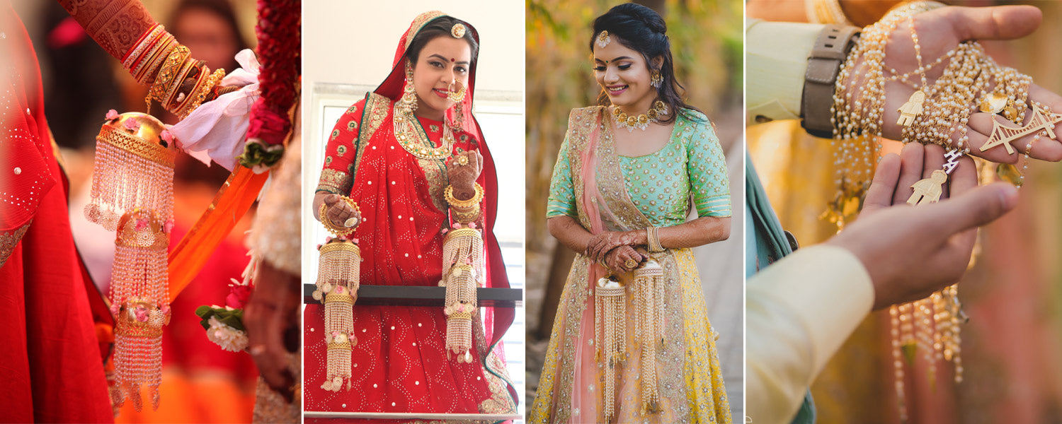 Our highly created custom made wedding wear is Kaleere. We have designed over 25 different Kaleeres for brides. These are not just usual Kaleeres they are as unique as all of our brides. Below are few pictures of Kaleeres that we created. The left one was inspired from pearls and flowers. The right one was more on the bride-groom story with personalised charms and pearl strands.