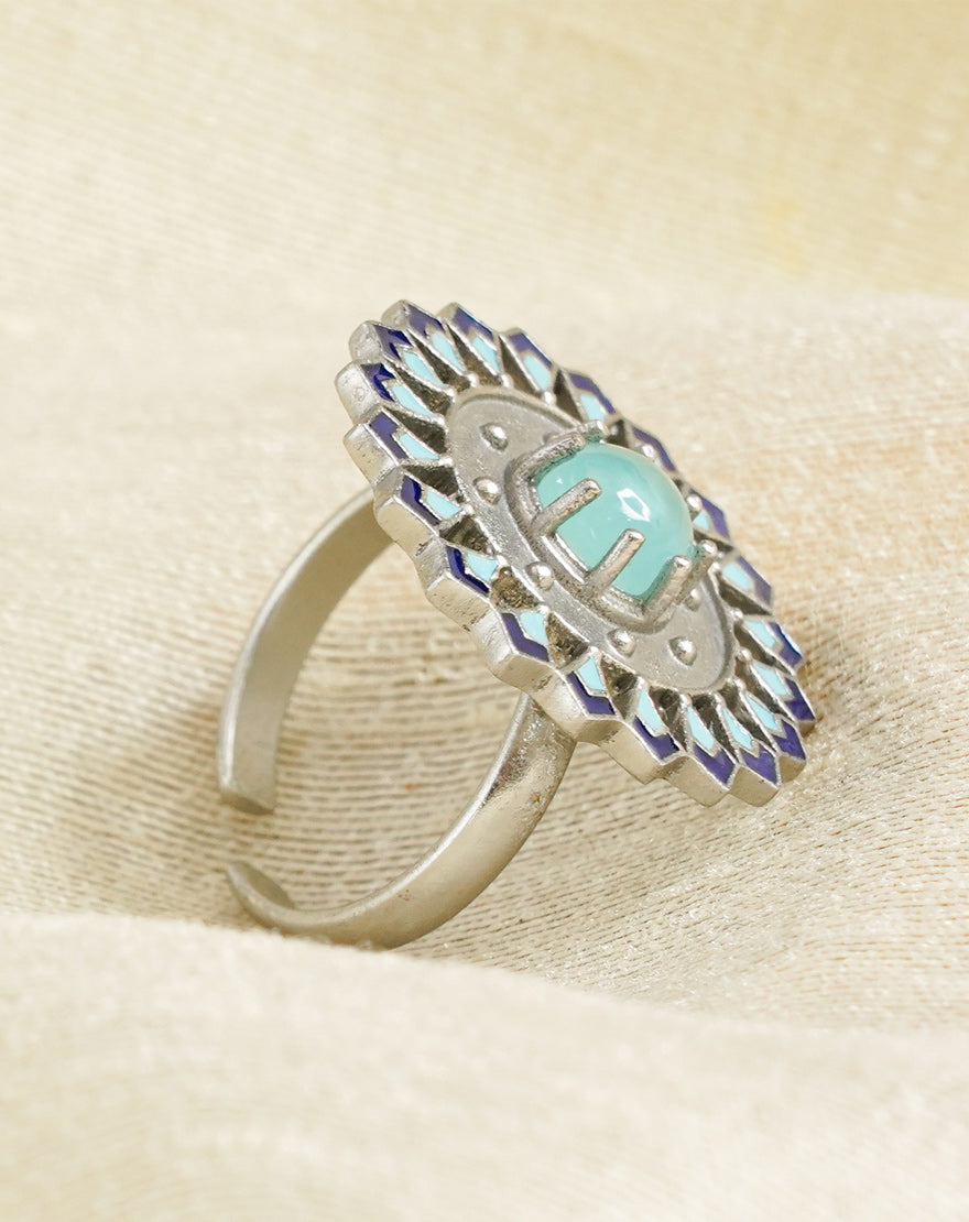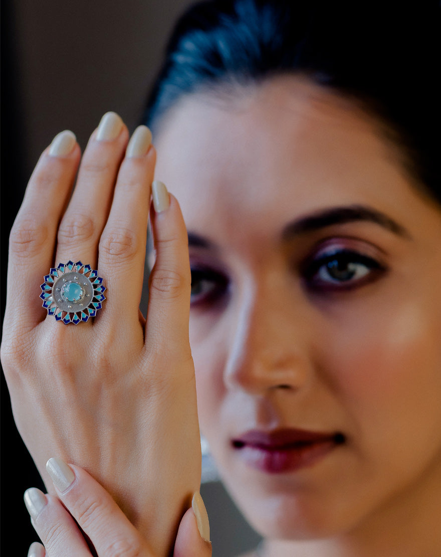 Aisha Ring Blue Aqua Chalcedony – This ring inspired from the architectural patterns found in the city of Marrakech (Morocco) handcrafted using silver plated brass with Sky blue and lapiz blue enamel and aqua chalcedony stones.