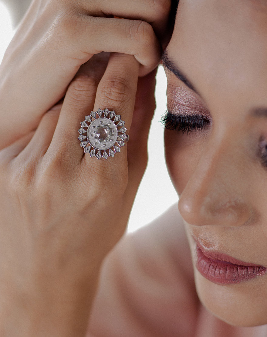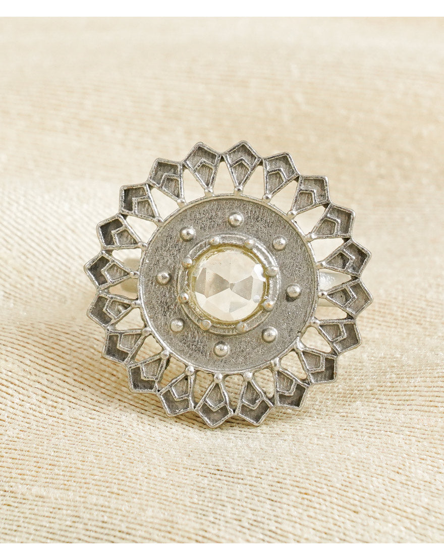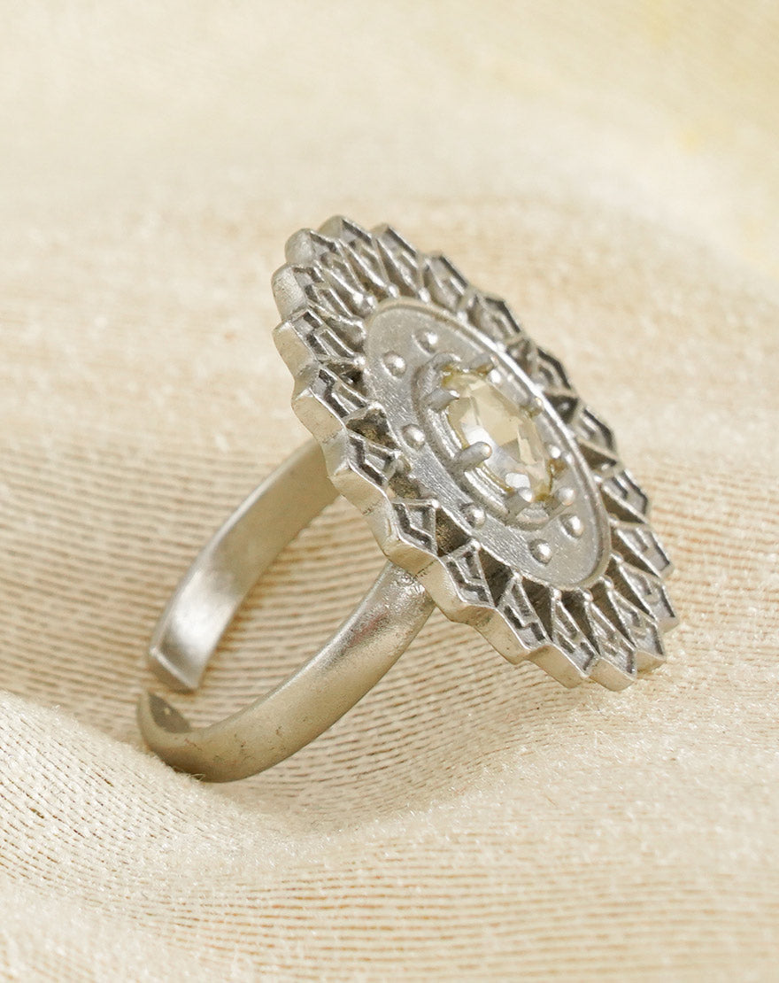 Aisha Ring Clear Quartz – This ring inspired from the architectural patterns found in the city of Marrakech (Morocco) handcrafted using silver plated brass with clear quartz stones.