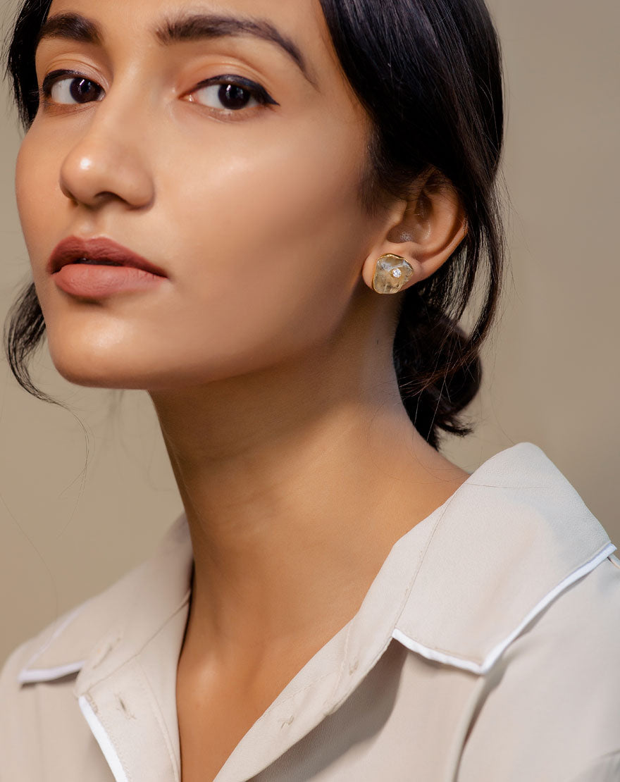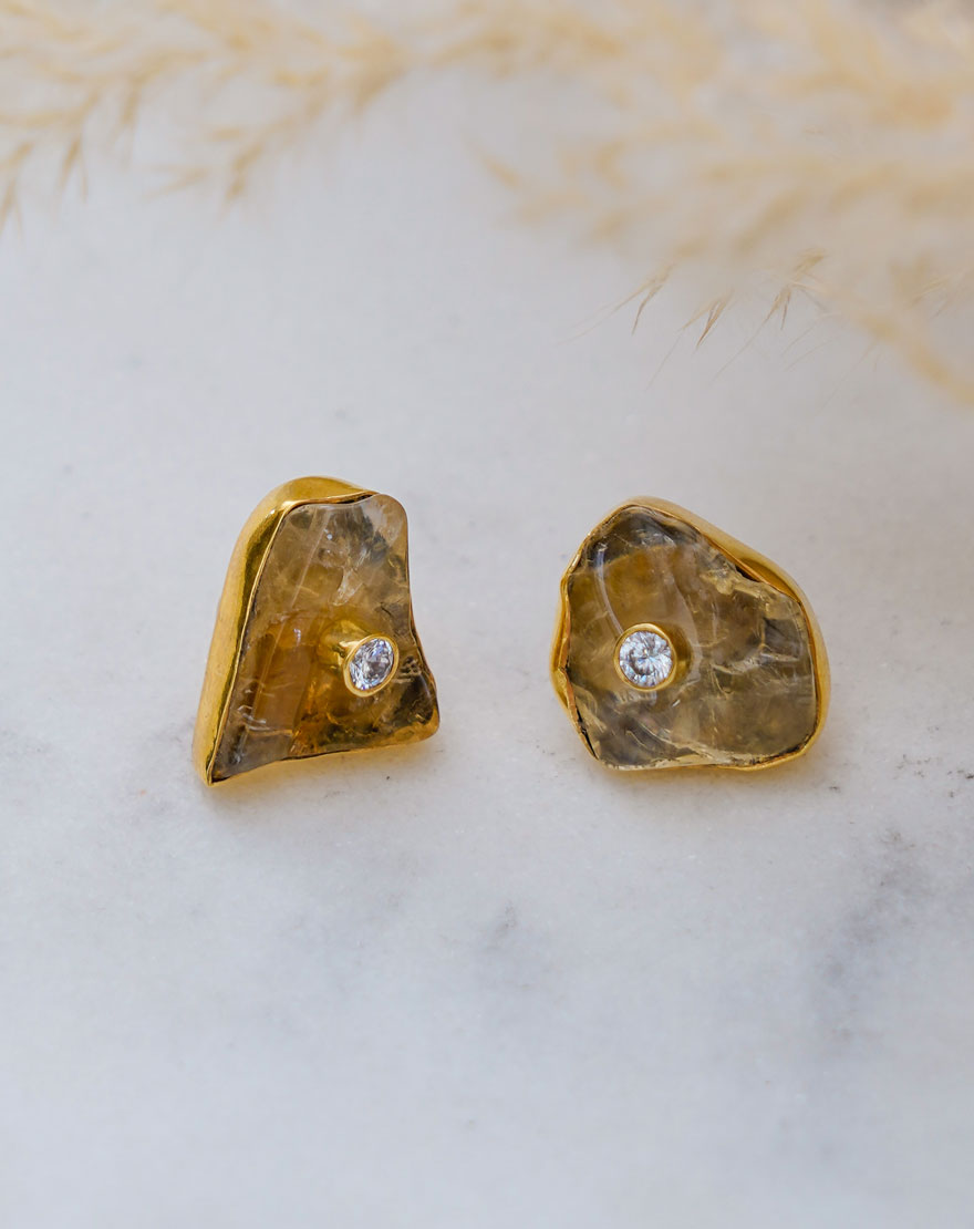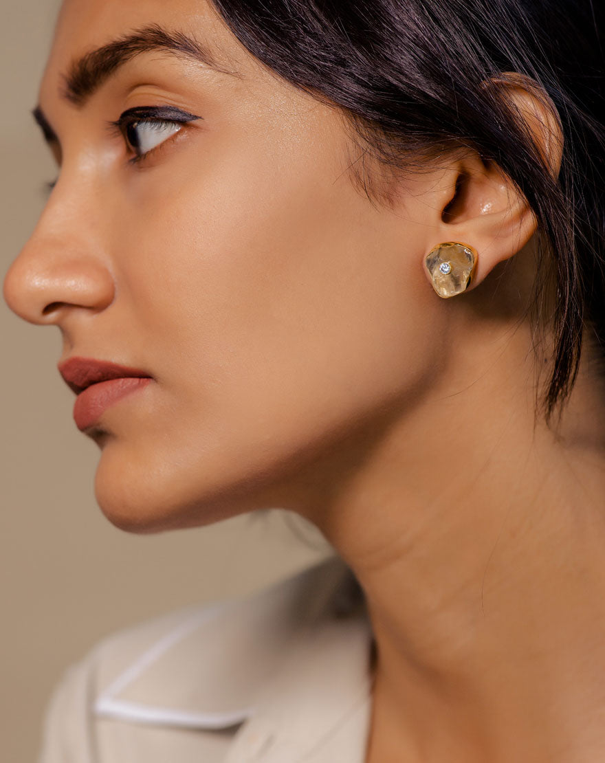 These dainty but statement making studs are handcrafted using 18k gold plated recycled brass with Citrine stone. You can styles these studs in multiple ways and are must haves for your wardrobe.