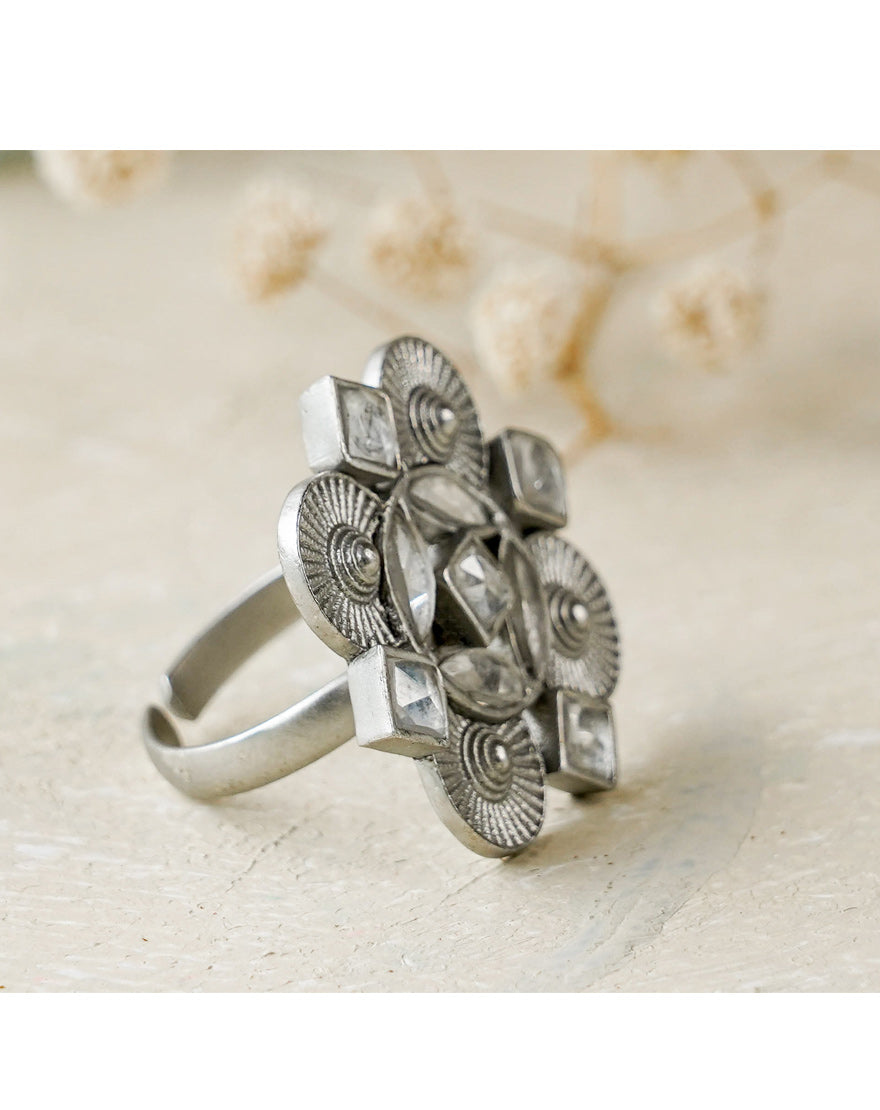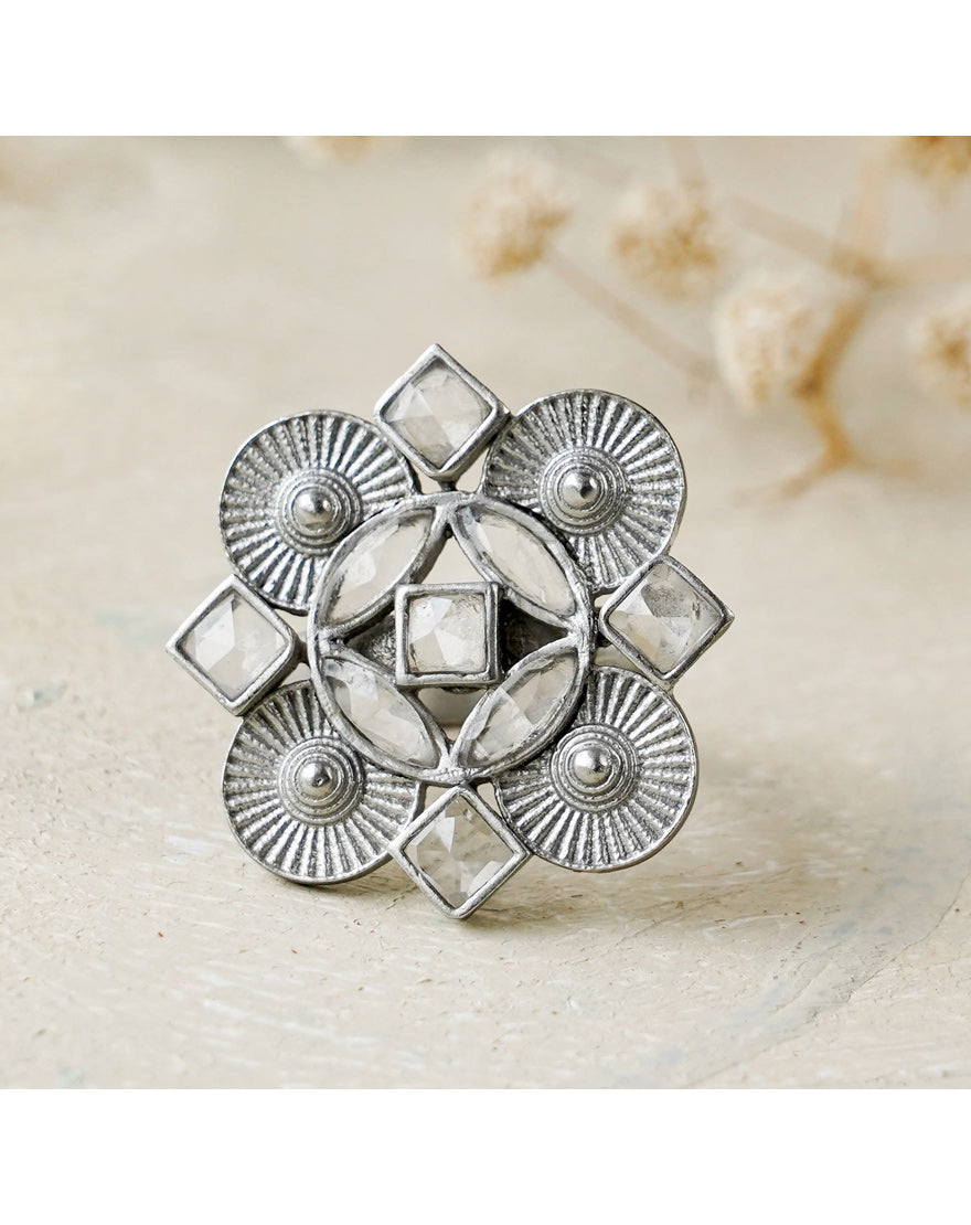Alia Ring Clear Quartz – This ring inspired from the architectural patterns found in the city of Marrakech (Morocco) handcrafted using silver plated brass with Clear Quartz stones.