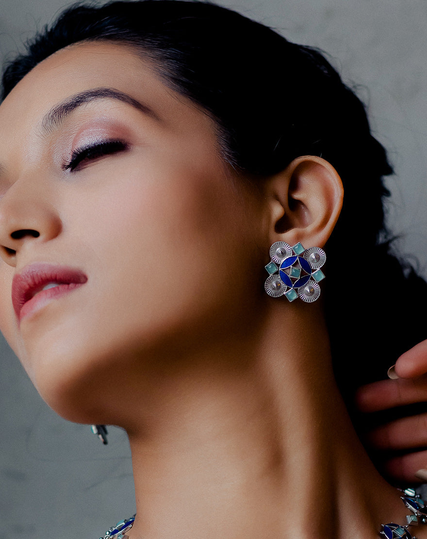 Alia Studs Blue Aqua Chalcedony – These stunning pair of earrings are inspired from the architectural patterns found in the city of Marrakech (Morocco) handcrafted using silver plated brass with sky blue and lapis blue enamel with Aqua Chalcedony stones. These earrings are feather light in weight and a perfect pair of Indian Contemporary style.
