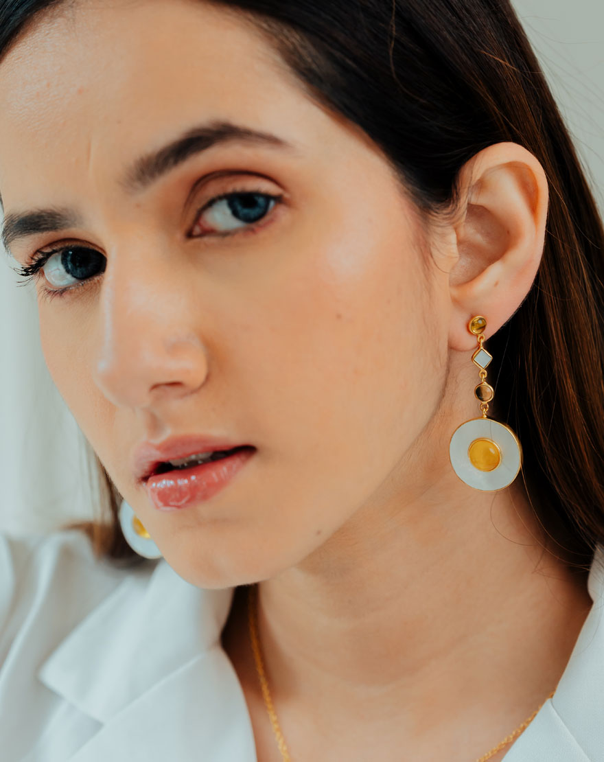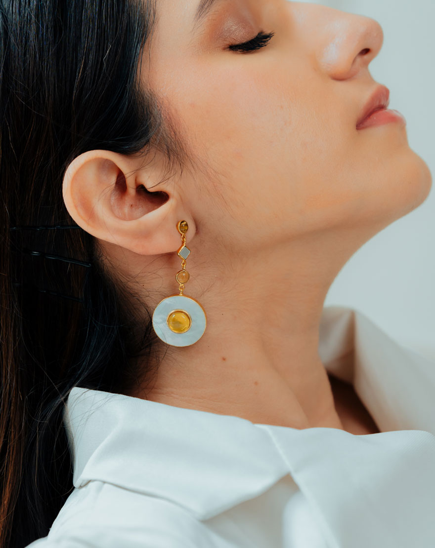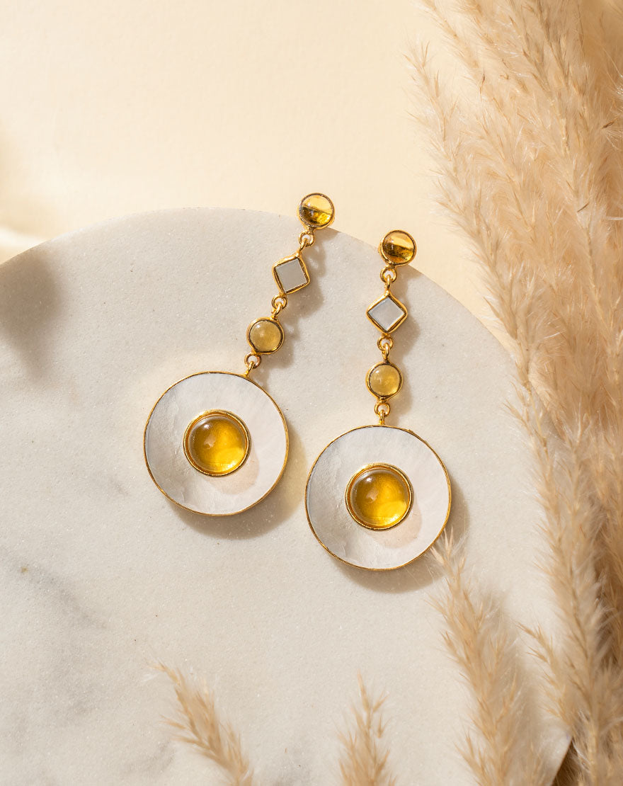 These beautiful earrings are inspired from architectural motifs found in palaces of Jaipur. Amber means sky in Sanskrit and other meaning of Amber is Yellow and Gold. Handcrafted using unique mother of pearl stones and citrine stone, set in modern silhouette. This is our take on festive modern jewelry. It is feather light in weight yet it is statement making.