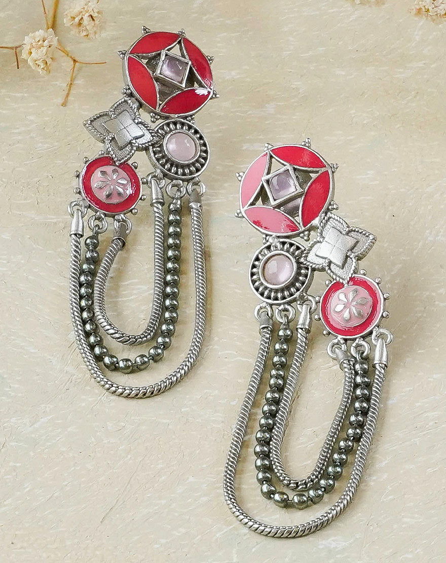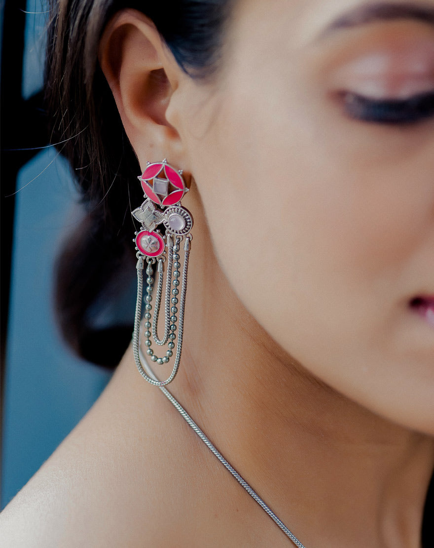 Aneesa Earrings Pink Rose Quartz – These stunning pair of earrings are inspired from the architectural patterns found in the city of Marrakech (Morocco) handcrafted using silver plated brass with rose pink and carnation pink hand-painted enamel and Rose Quartz stones. These earrings are feather light in weight and a perfect pair of Indian Contemporary style.
