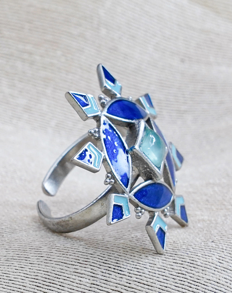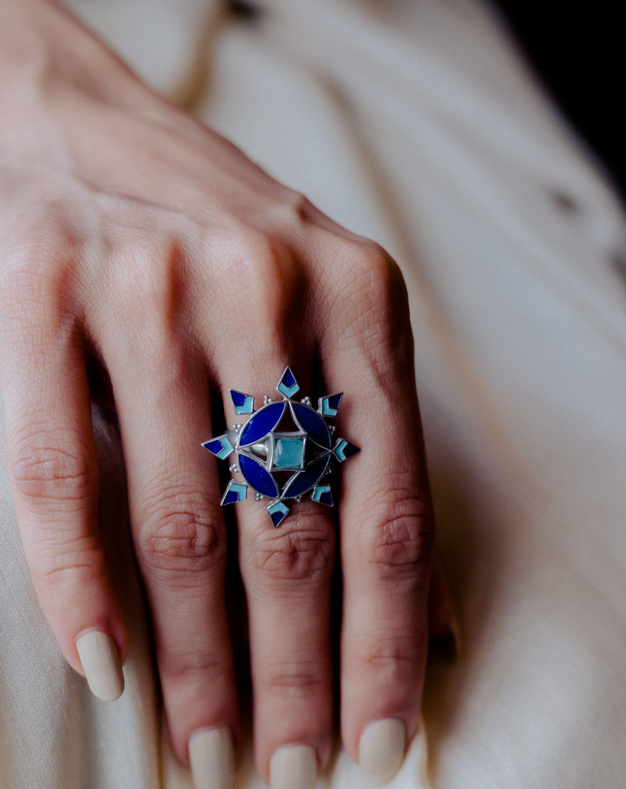 Aza Ring Blue Aqua Chalcedony – This ring inspired from the architectural patterns found in the city of Marrakech (Morocco) handcrafted using silver plated brass, hand-painted sky blue and lapis blue enamel with aqua chalcedony agate.