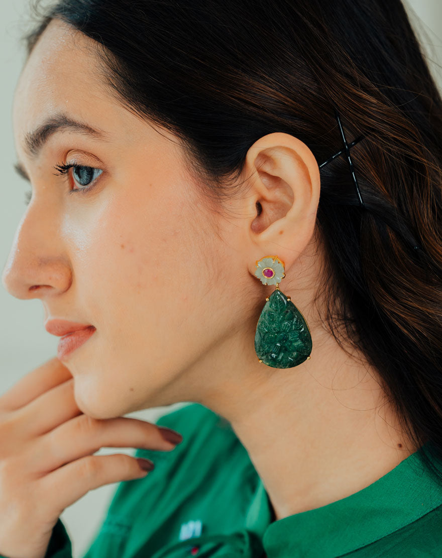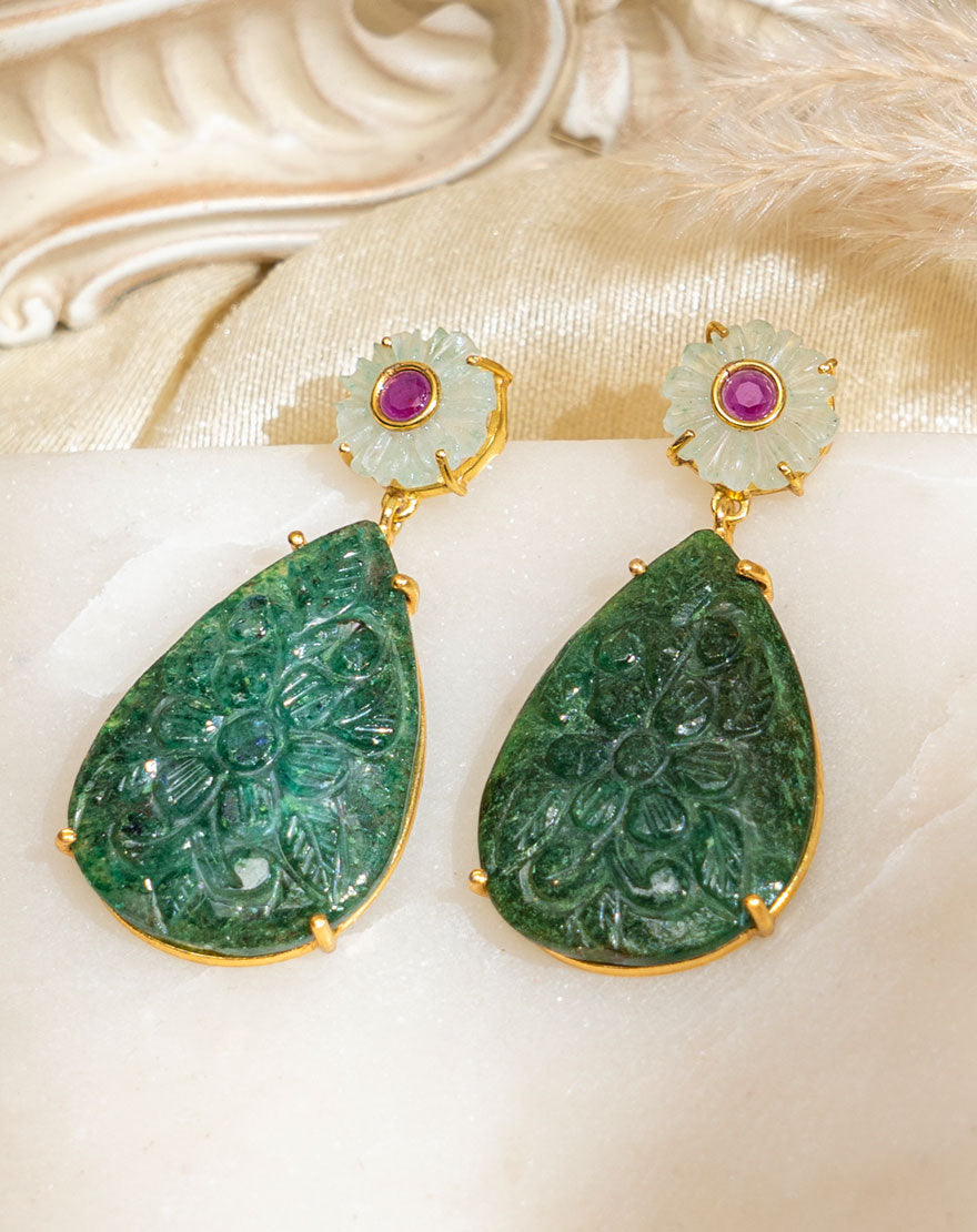 Bahaar Earrings is inspired from the Mughal Gardens and the beautiful flowers which are fully bloomed in the season of Spring. The beautiful stones in these earrings Green Strawberry Quartz and Green Aventurine stones are hand carved with floral motifs on it. Completing this earring with unique Moissanite stone, these earrings are perfect pair for this festive season.
