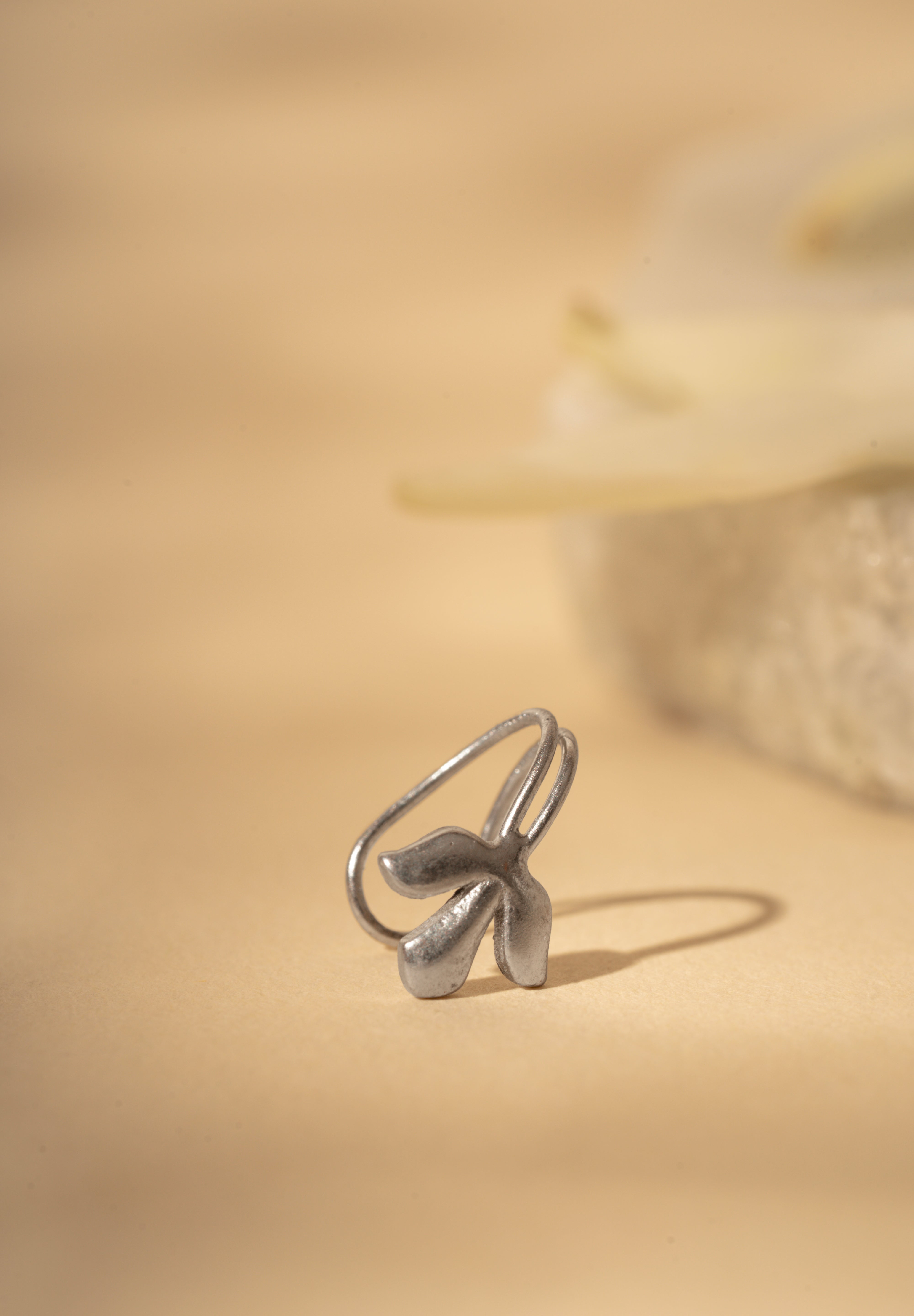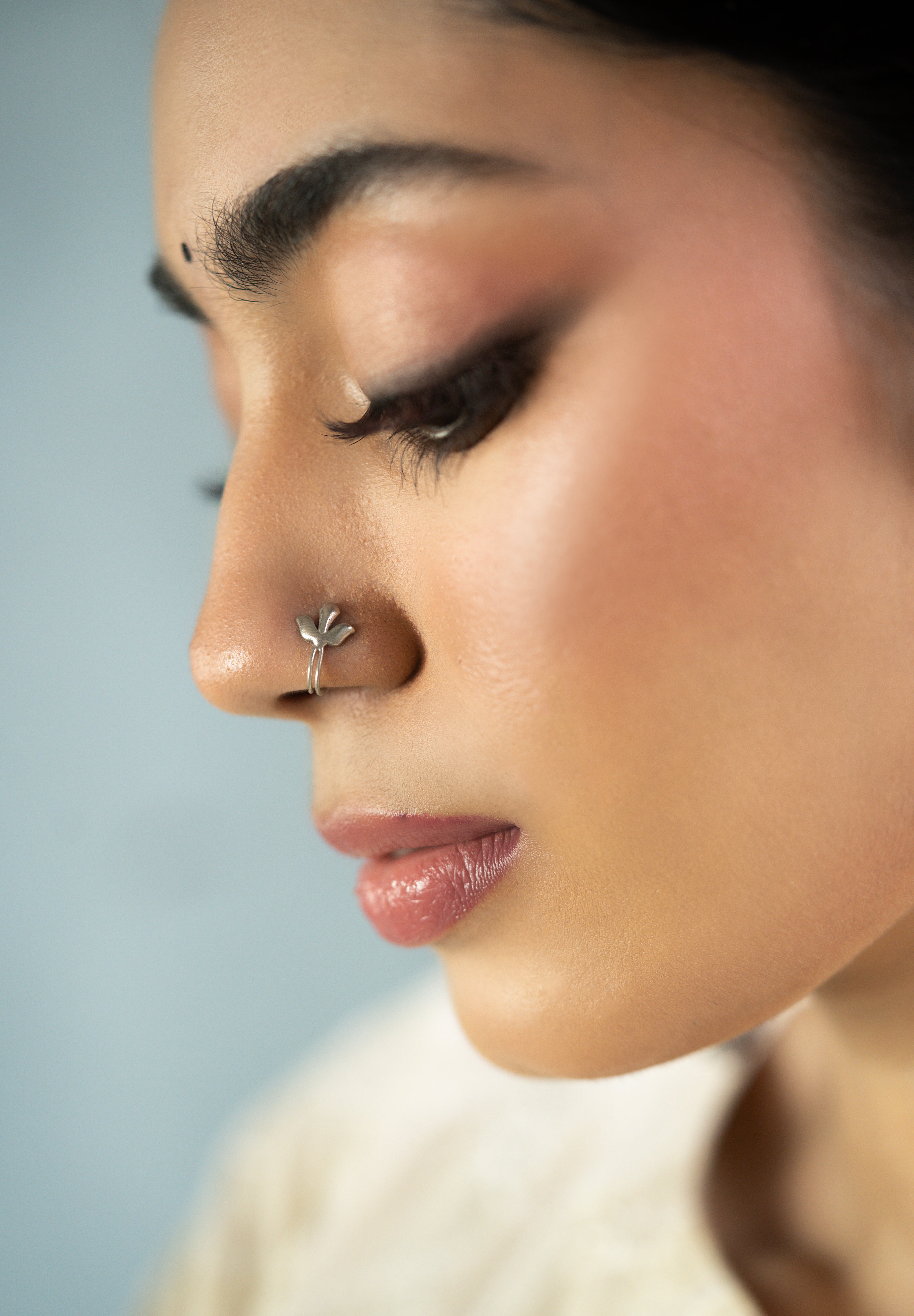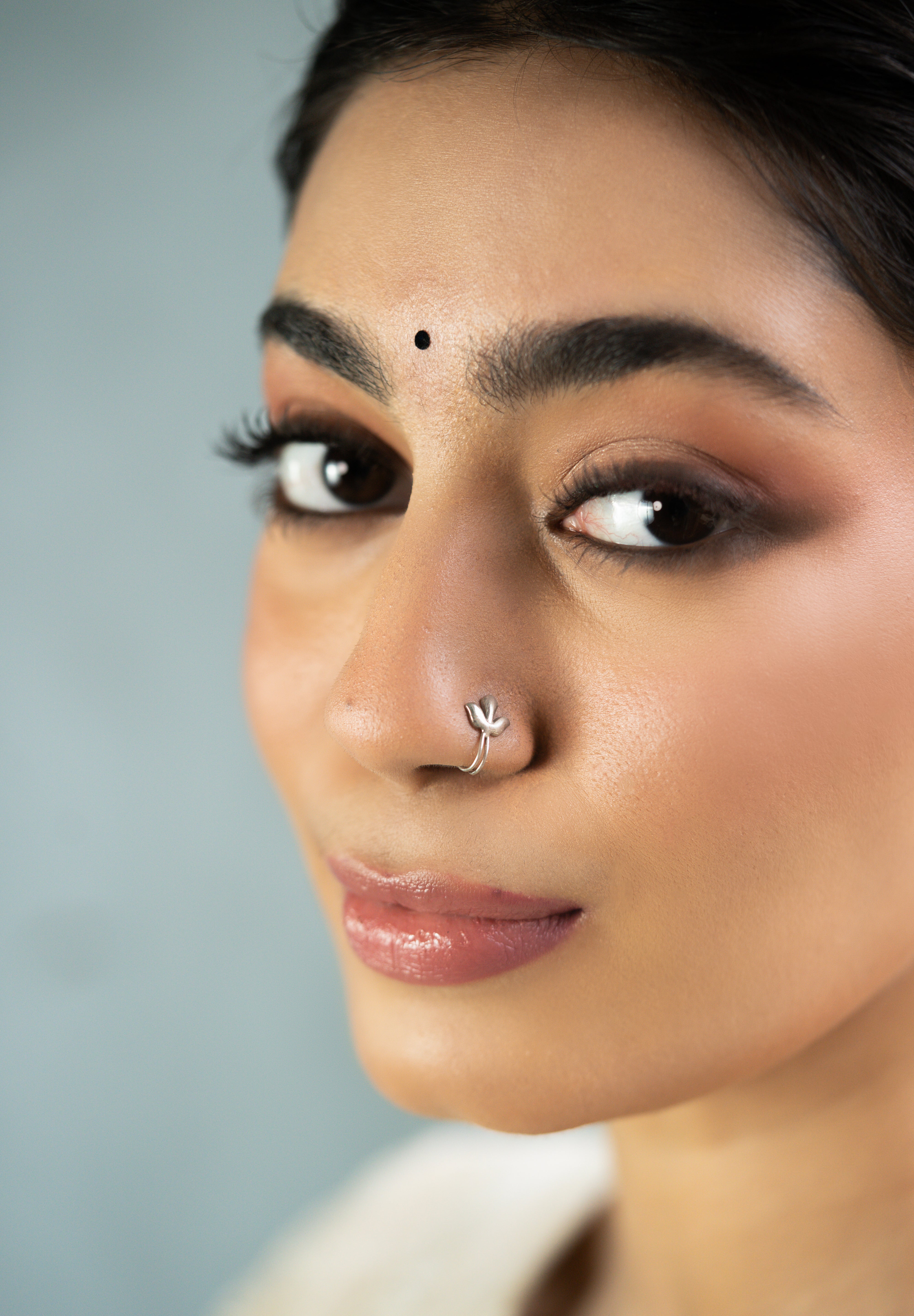 Handcrafted using beautiful leaf motif on silver plated brass. This nose pin is a statement in itself. No piercing required.