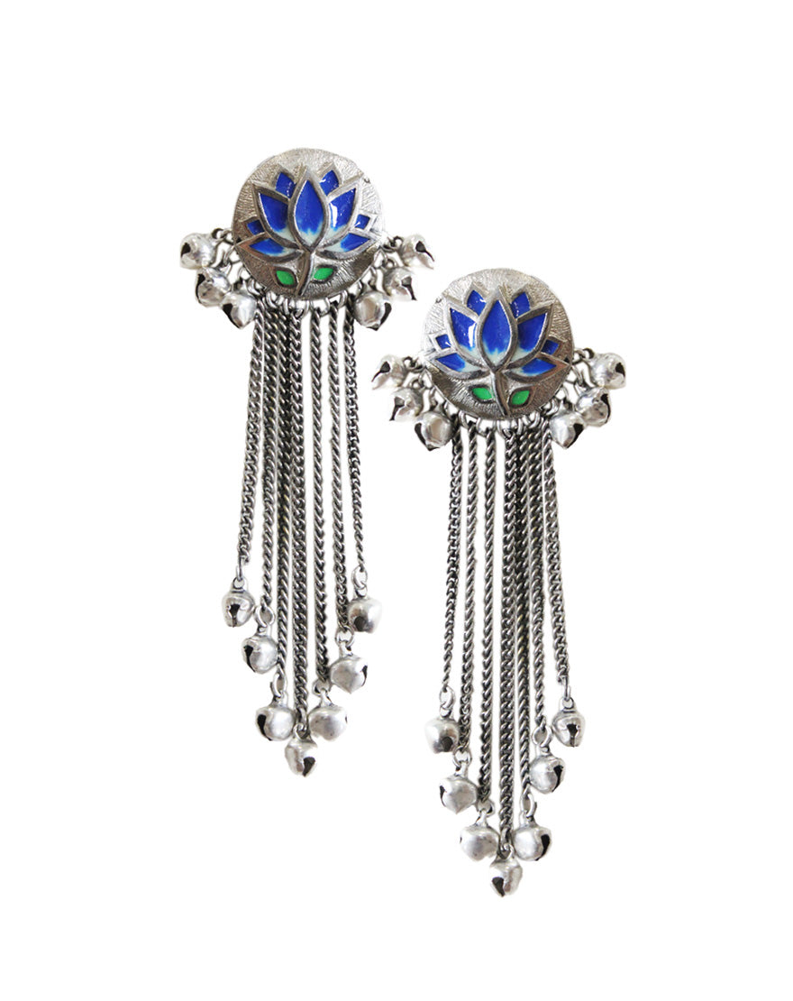 Blue Lotus Silver Tassels : Handcrafted silver tassel earrings inspired from “Pichwai” motifs with handpainted enamel.