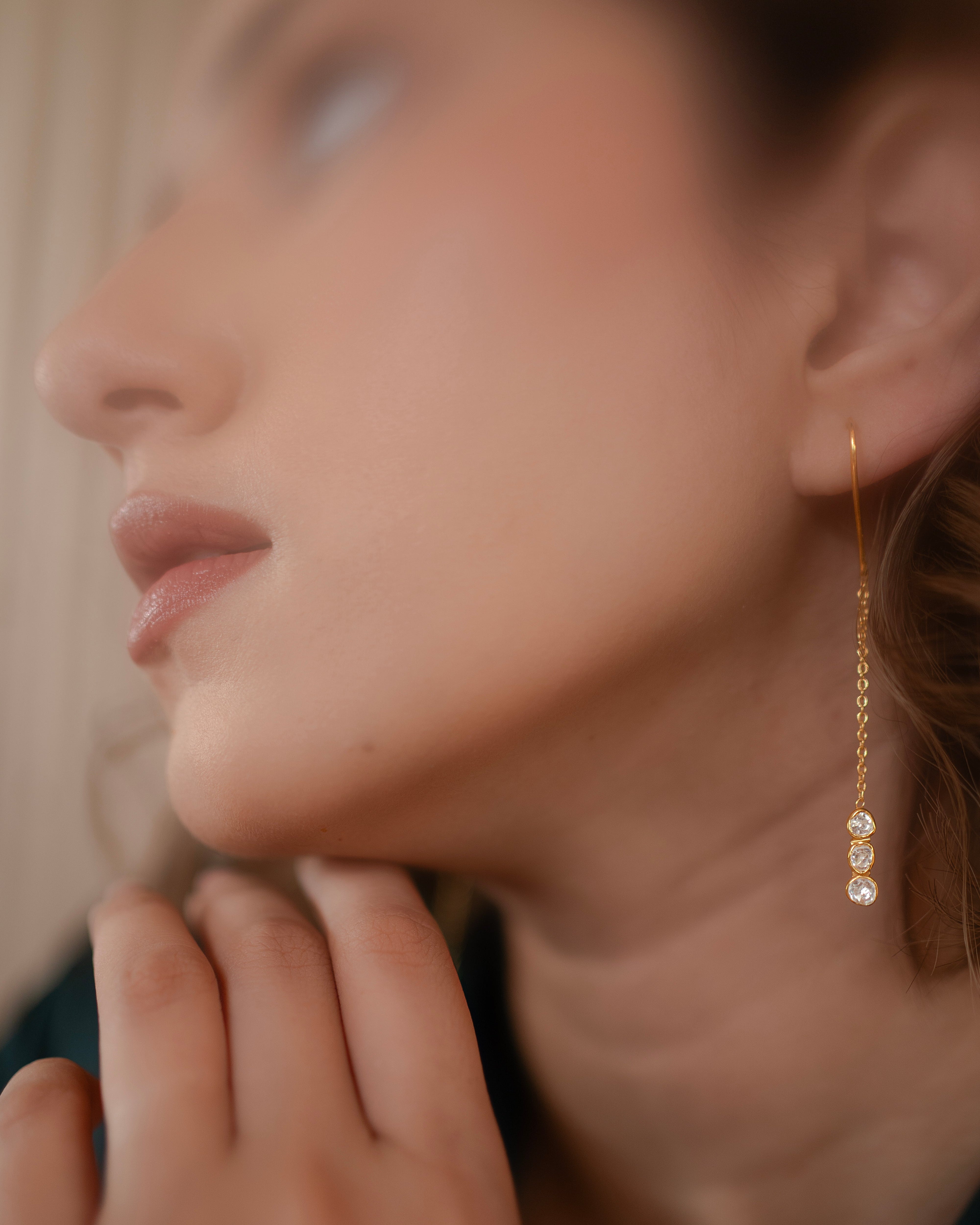 Light as air and endlessly graceful, the Celeste Earrings are designed to dance with you — catching the light with every subtle movement. Three bezel-set uncut moissanite stones are delicately strung on fine gold chains, creating a soft cascade that gently grazes the jawline.