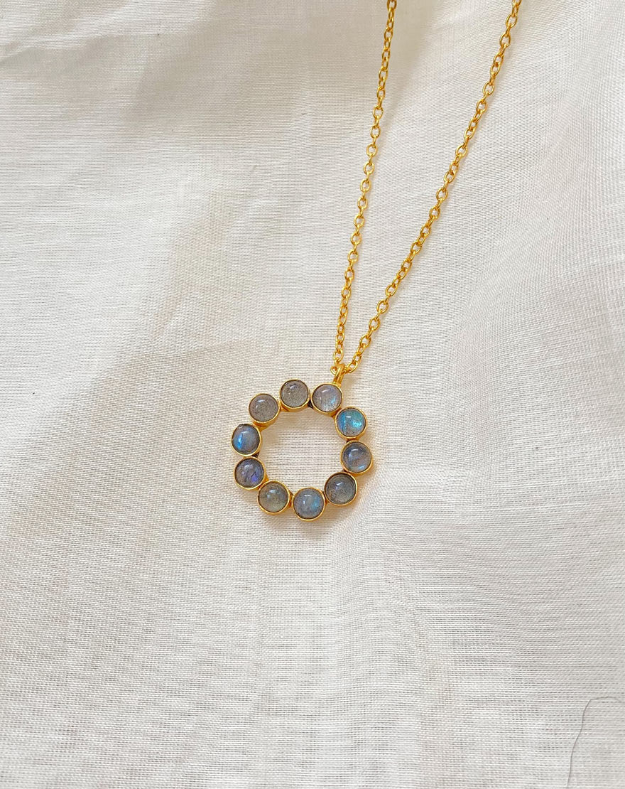Chloe means blossom. This beautiful and dainty necklace is handmade using finest labradorite which are feather light in weight on 18k gold plated brass.