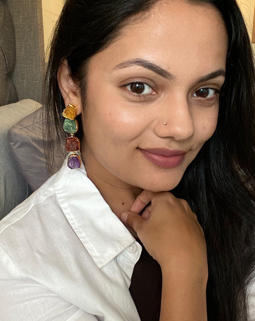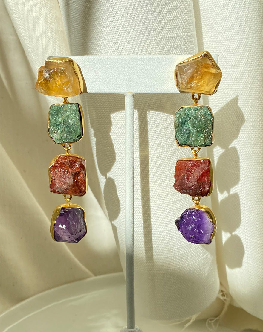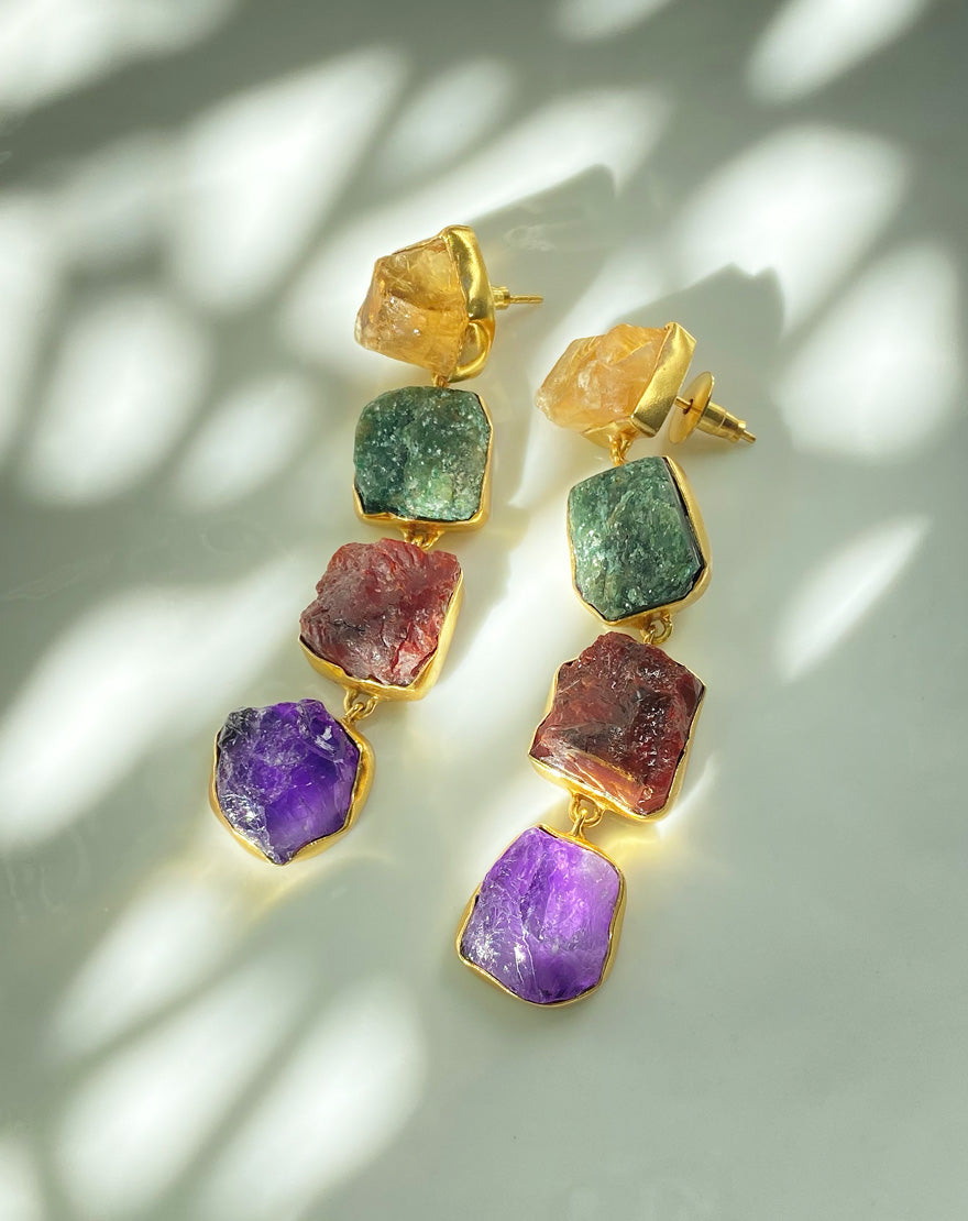 These stunning statement making earrings are handcrafted using raw citrine, amethyst and strawberry quartz stones, dipped in 18k gold. These earrings will surely stand out and will complete your look.