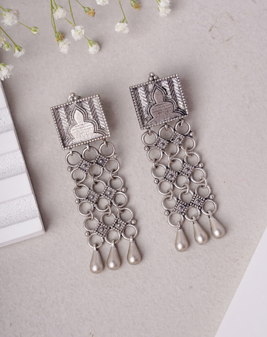 These stunning ‘Devi’ danglers draw inspiration from the intricate details of ancient Indian doors found in palaces and monuments, perfect for the goddess within you. Crafted from gunmetal-colored silver-finished brass.