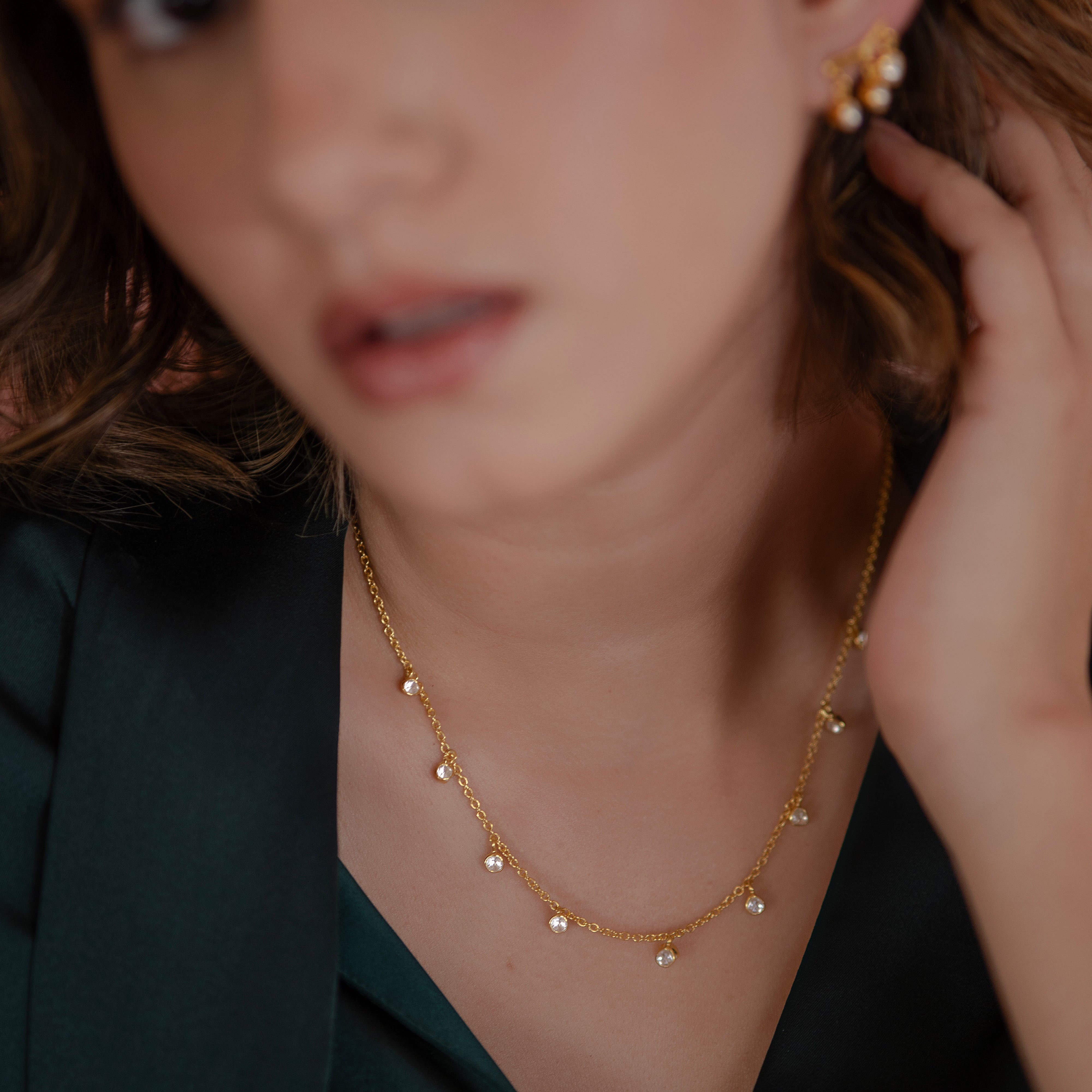 The Dew Drop Necklace is a stunning handcrafted jewelry piece that blends elegance with timeless charm. Featuring moissanite stones, bezel-set to resemble delicate dewdrops, this necklace sparkles beautifully with every movement. Made from 925 sterling silver and finished with a thick 18K gold plating, it offers both durability and a luxurious shine. Designed for versatility, this gold-plated moissanite necklace is perfect for layering or wearing solo, making it an essential accessory for both casual and formal occasions.