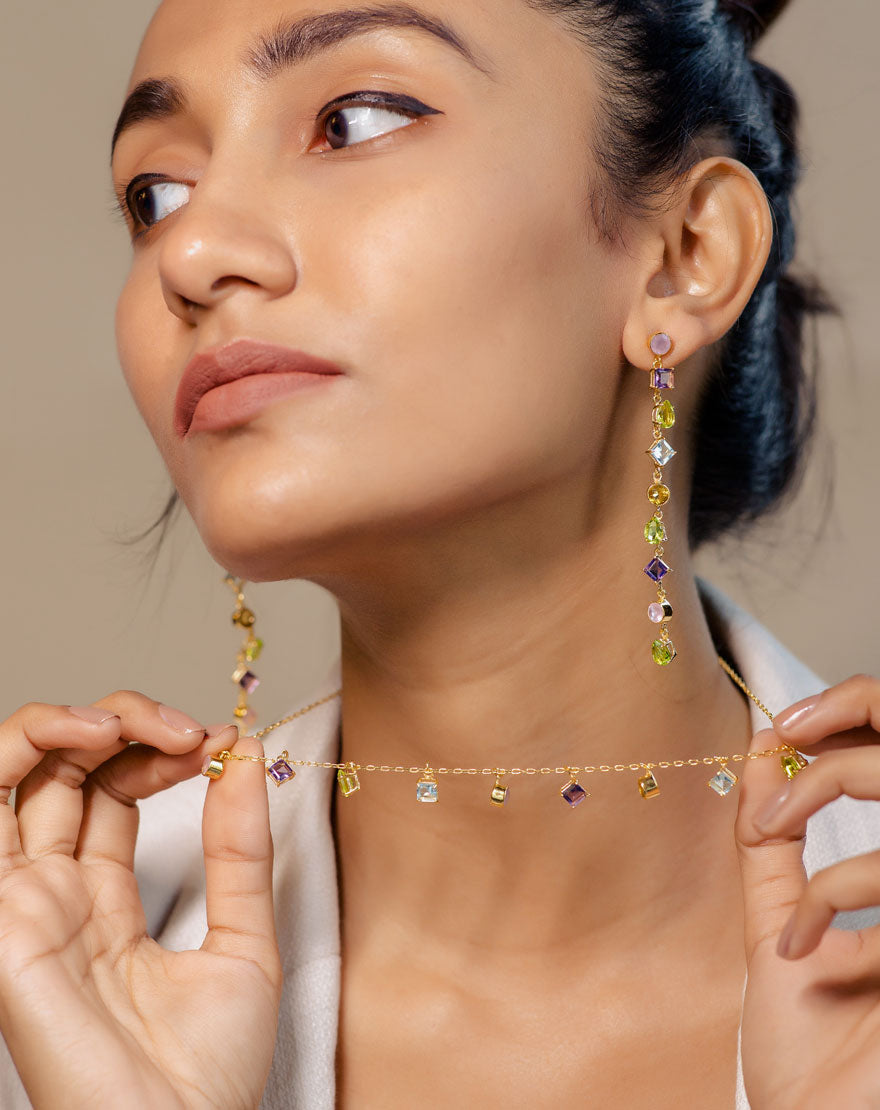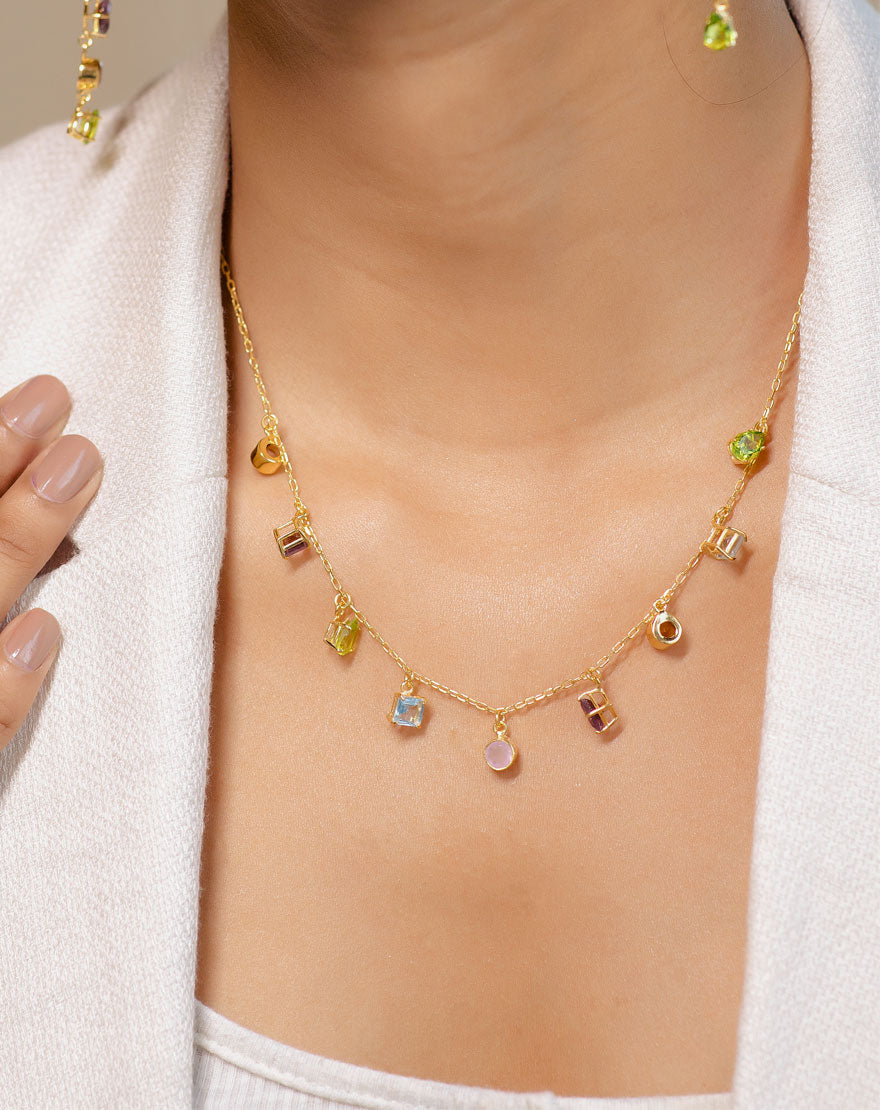 Diana Necklace is colorful elegance! This minimal yet statement making necklace is handcrafted using gold plated recycled brass with multicolored gemstones.