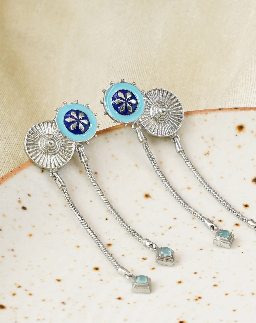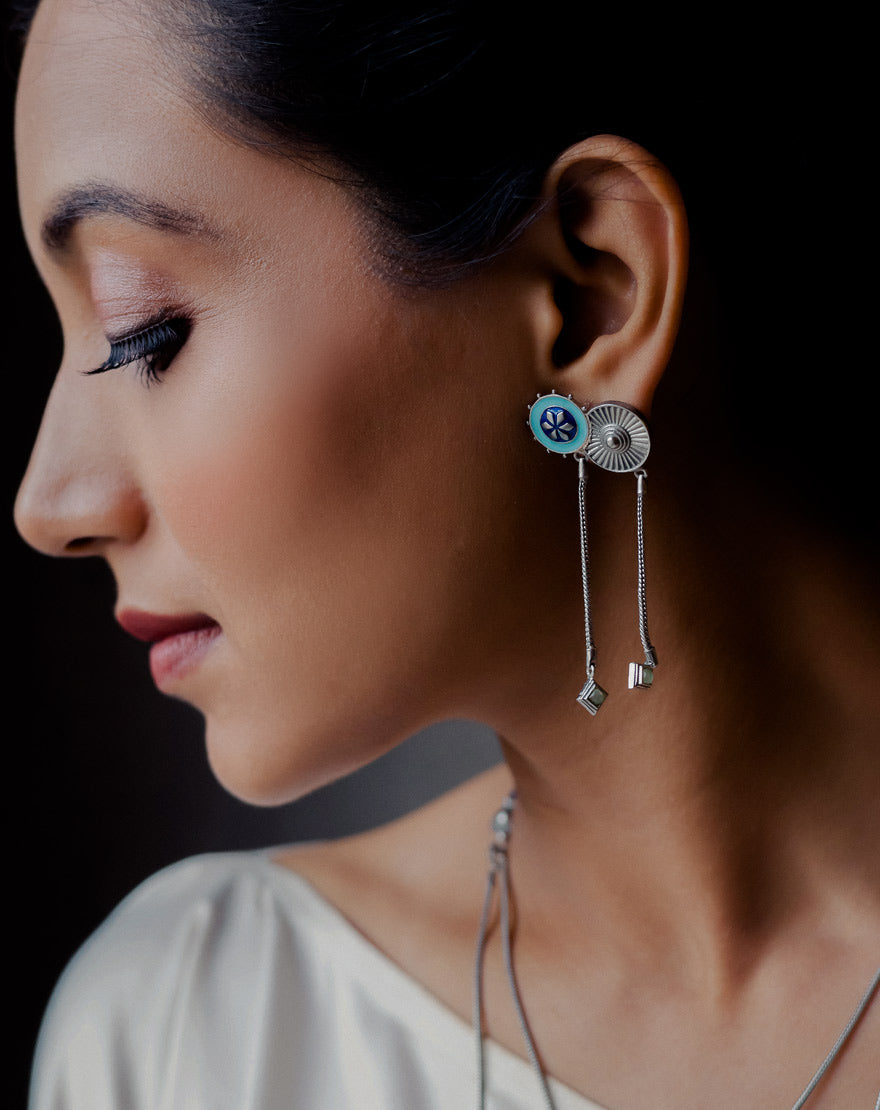 Faiza Blue Aqua Chalcedony – This pair of delicate earrings are inspired from the architectural patterns found in the city of Marrakech (Morocco) handcrafted using silver plated brass with sky blue and lapis blue hand-painted enamel and Aqua Chalcedony stones. These earrings are feather light in weight and a perfect pair of Indian Contemporary style.