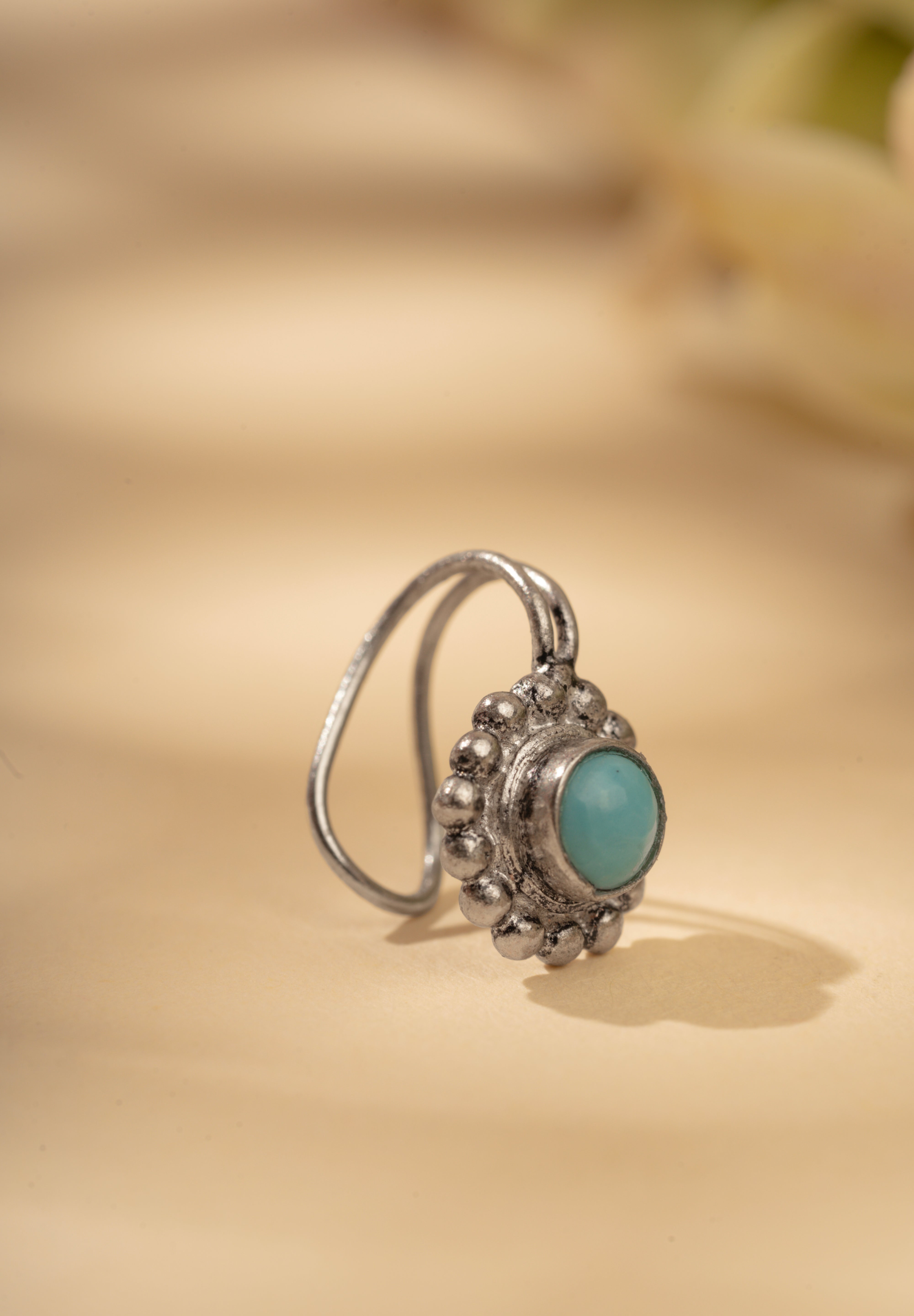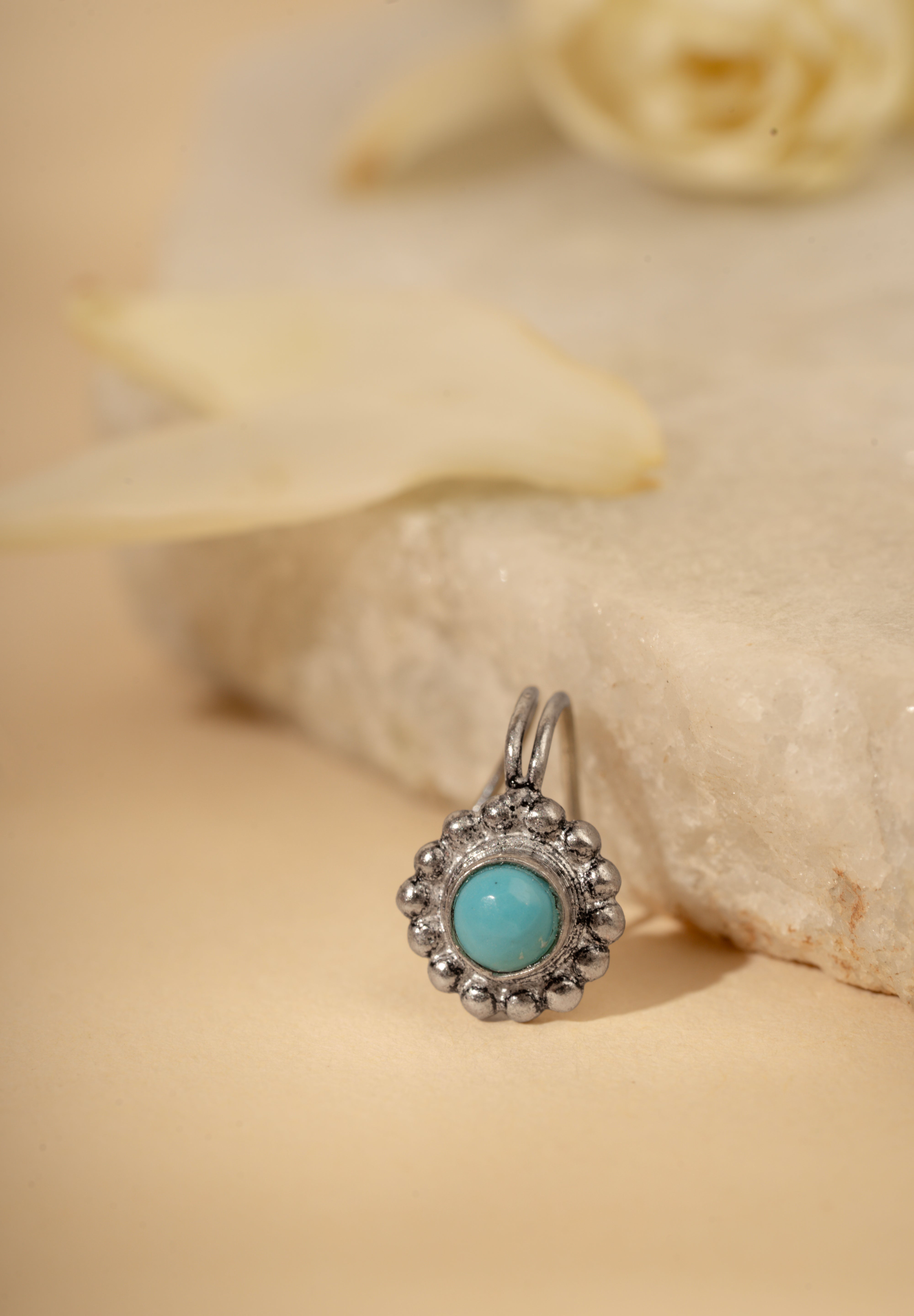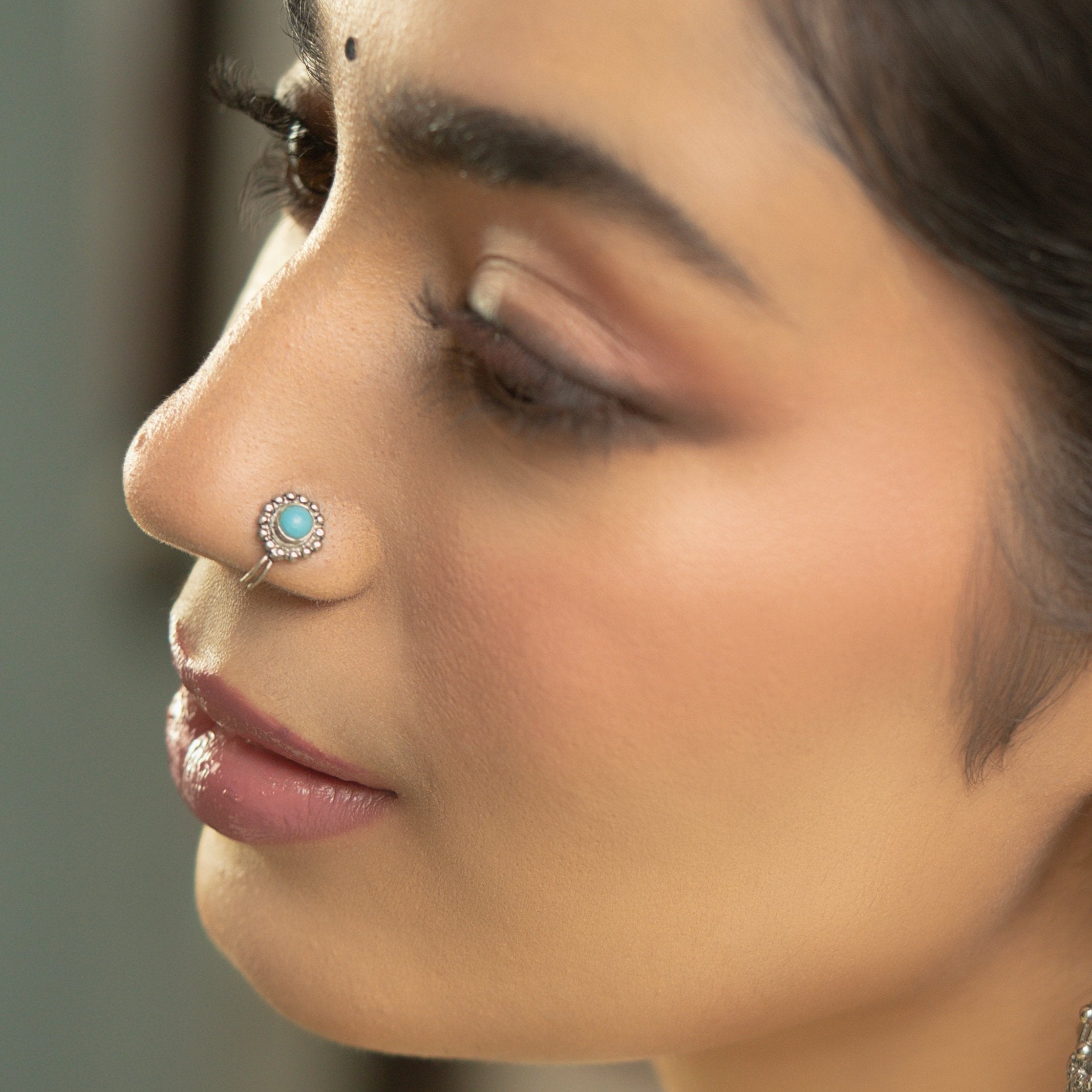 Inspired by the Firoza stone, a symbol of success, victory, and good fortune, this handcrafted nose pin is a delicate yet striking piece of jewelry. Featuring a radiant Firoza stone, the design is enhanced by an intricate Mughal art-inspired motif, offering a blend of traditional elegance and modern style. Made from silver-plated brass, this nose pin adds a touch of timeless beauty to any look, perfect for the festive season or everyday wear.