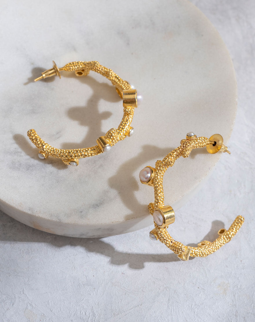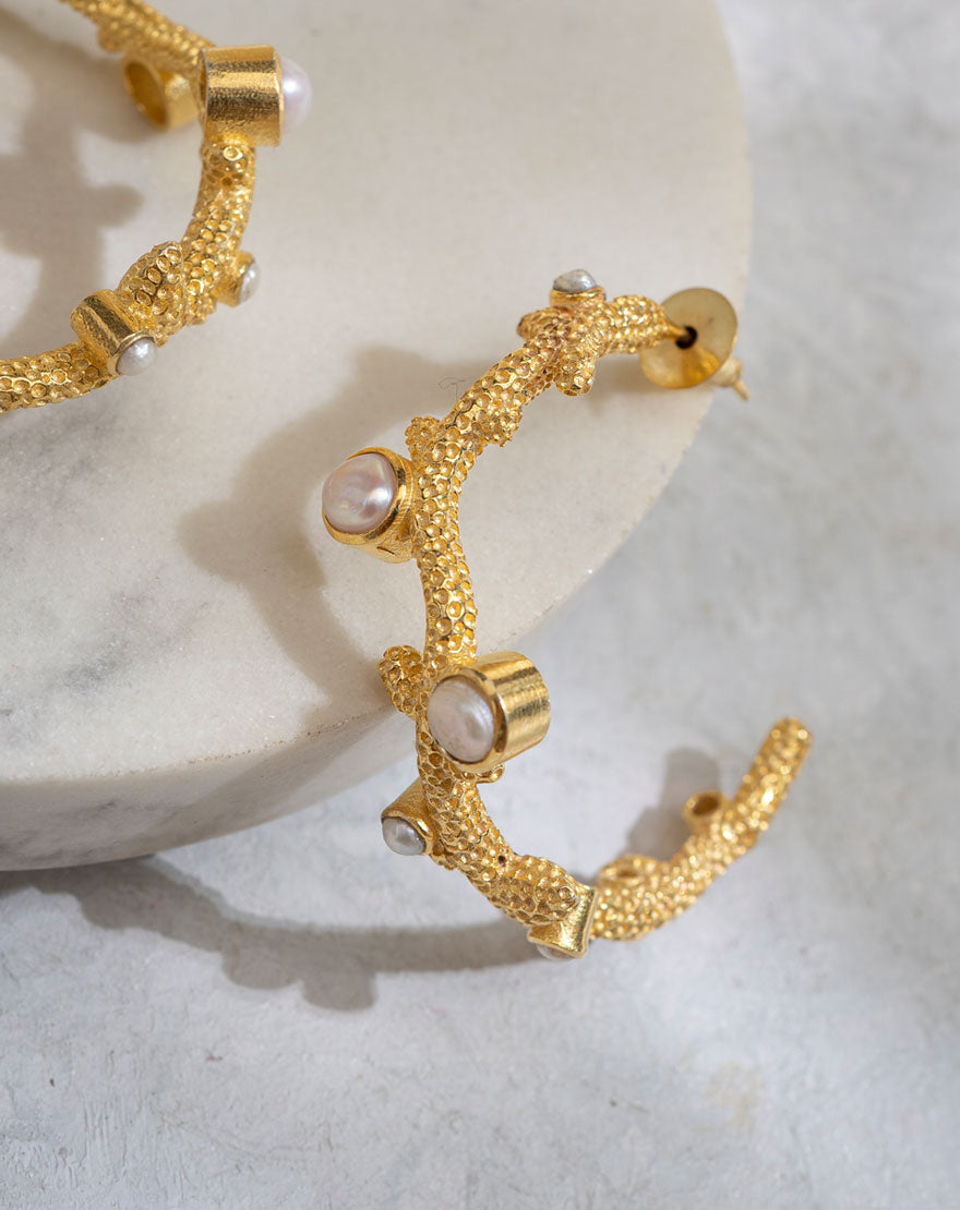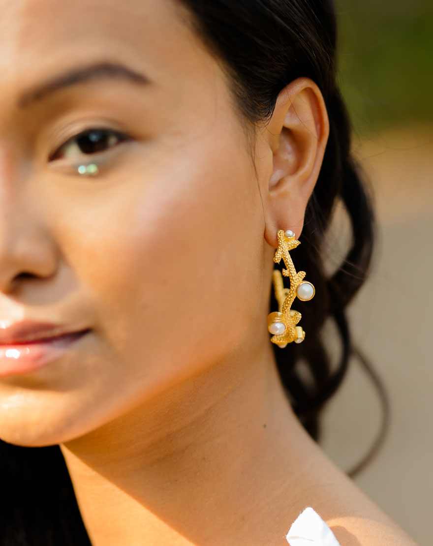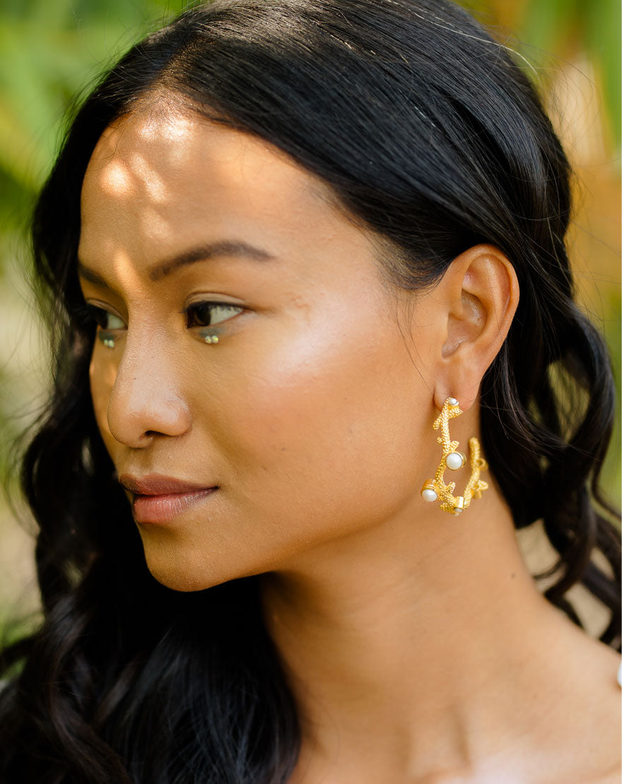 These stunning and statement making hoops are inspired from corals found in the waters of Maui Hawaii. These hoops are handcrafted using 18k gold plated brass with fresh water pearls. The detailing on these earrings are very similar to the corals found in the sea.