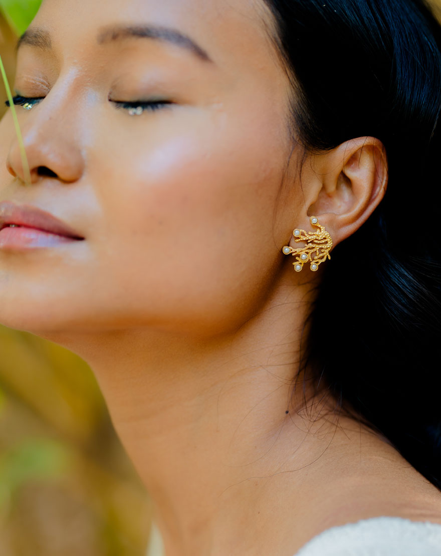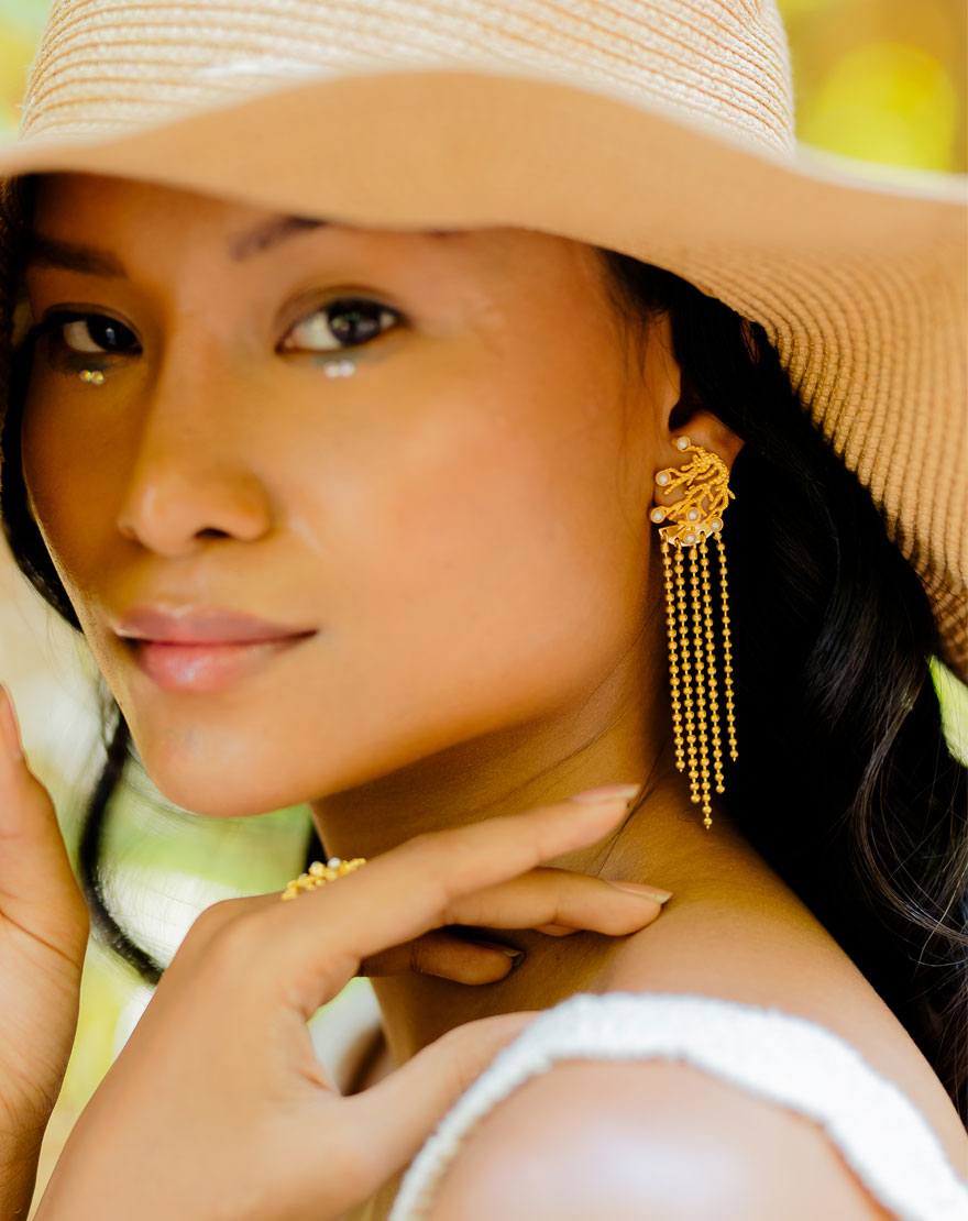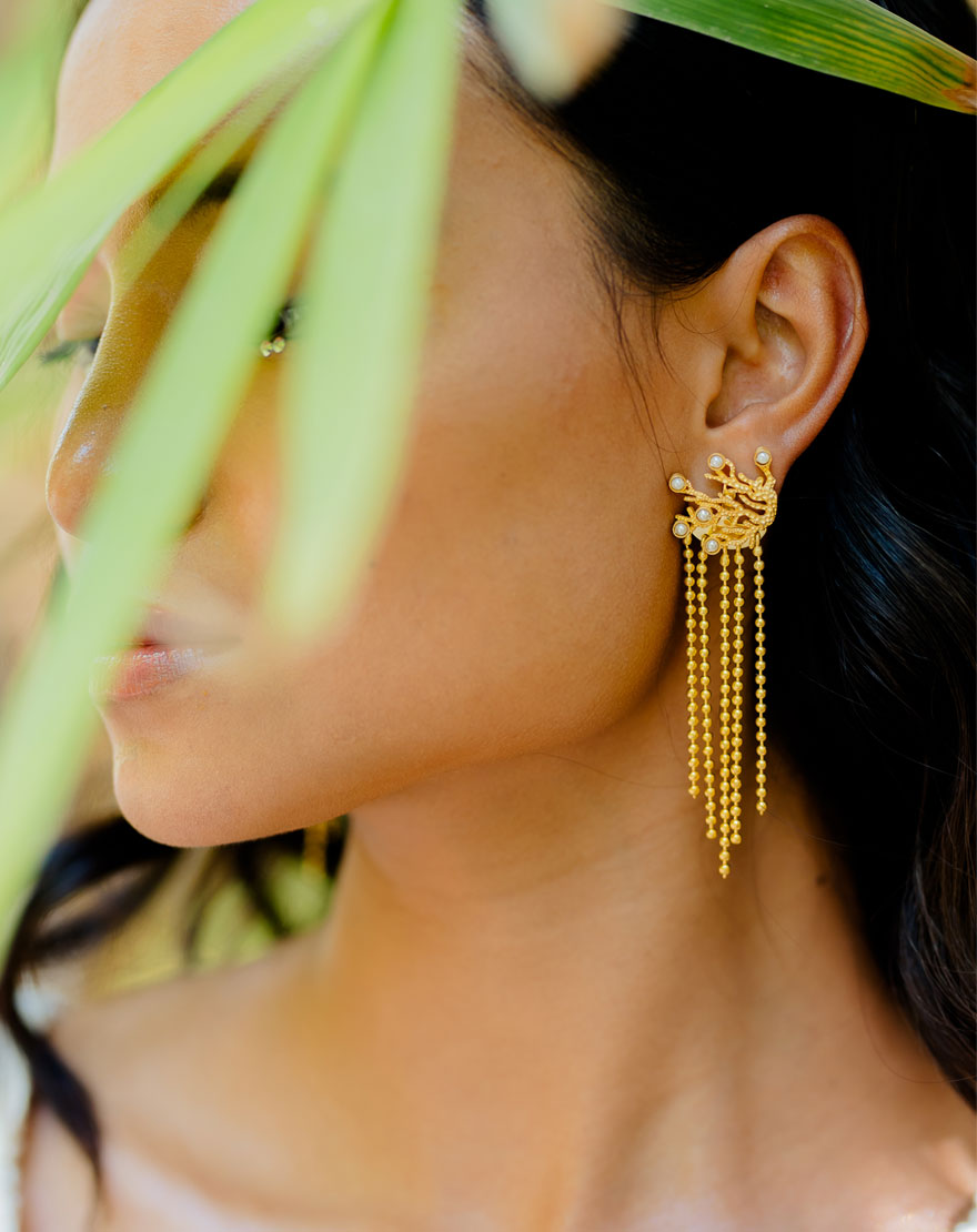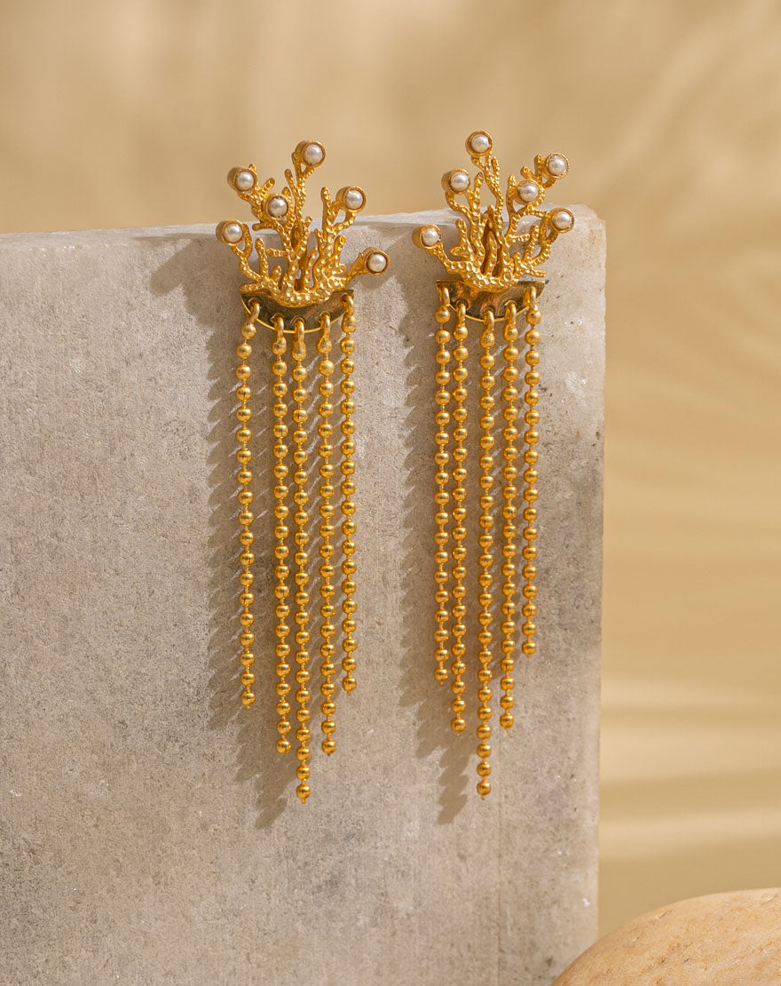 These versatile Gold Reef Tassels are detachable and can be worn in 3 ways. You can remove the tassel part and wear just the studs and if you feel to add a little drama lo your look then you can add the tassels and make a statement. These earrings are handcrafted using 18k gold plated brass with pearl detailing.
