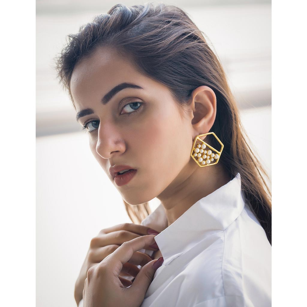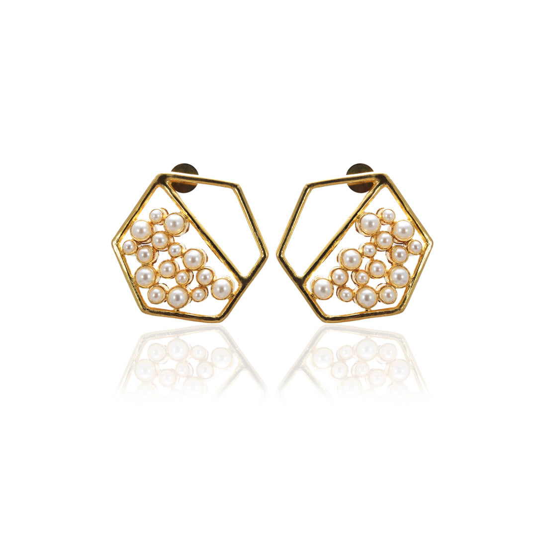 Gold Pear Studs – Hexagon – Handcrafted statement making studs made using pearls on 1 micron gold plated brass. Perfect for brunch wear or a night out look. Feather light statement earrings!