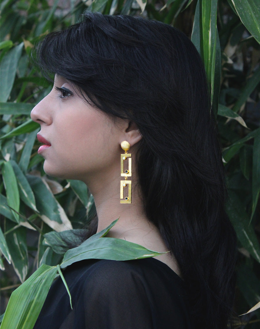 Golden Tetris Danglers : Inspired from sleek geometry, handcrafted using finest pearls and good quality gold plated brass with black enamel to make it look more minimal.