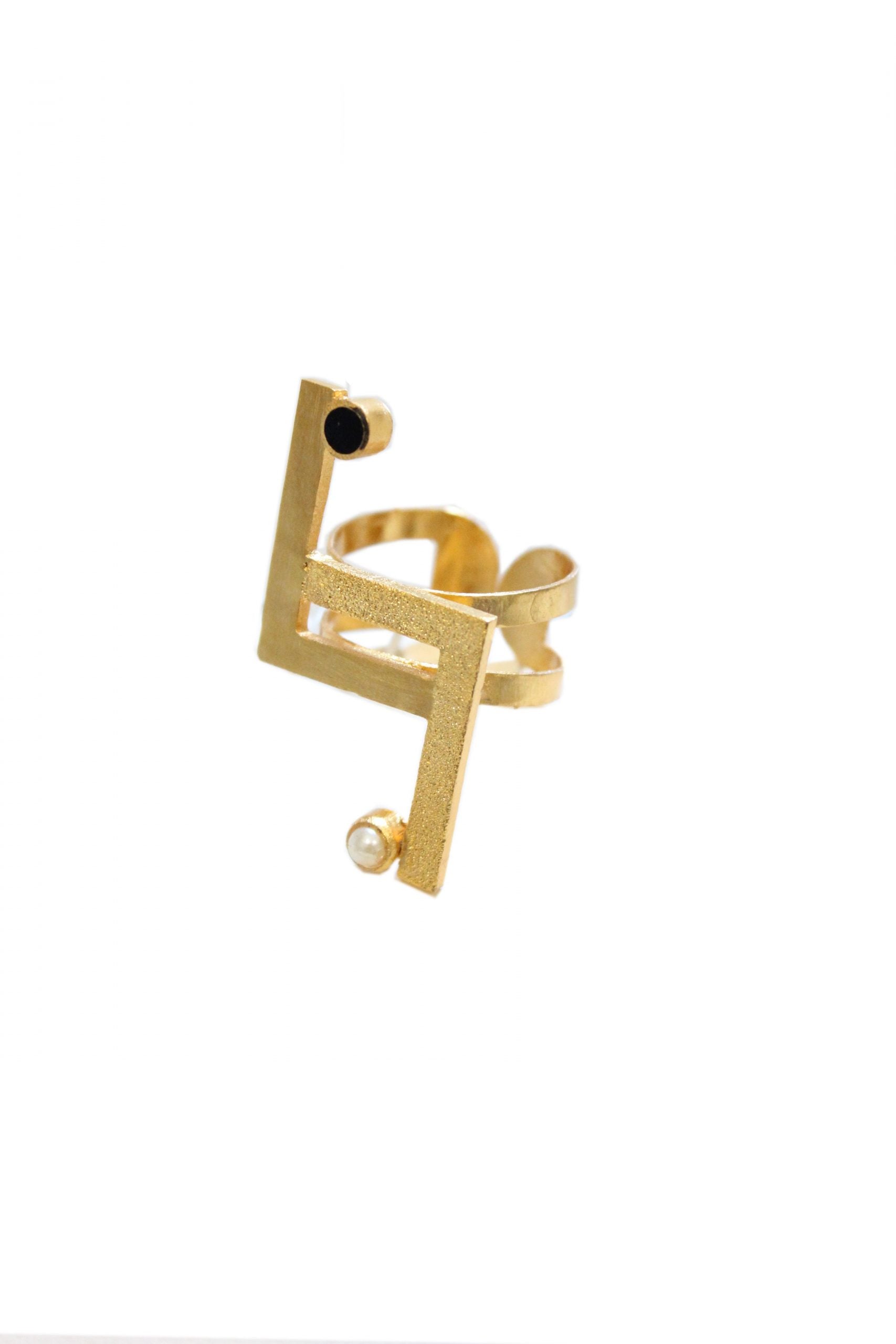 Golden Tetris Ring (Vertical) : Inspired from sleek geometry, handcrafted using finest pearls and good quality gold plated brass with black enamel to make it look more minimal.