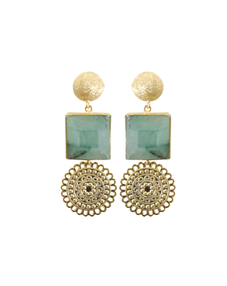 Green and Gold Dust Earrings : Handcrafted using malachite stones on gold plated brass with jail cut motif circle. Contemporary earrings for occasion wear.