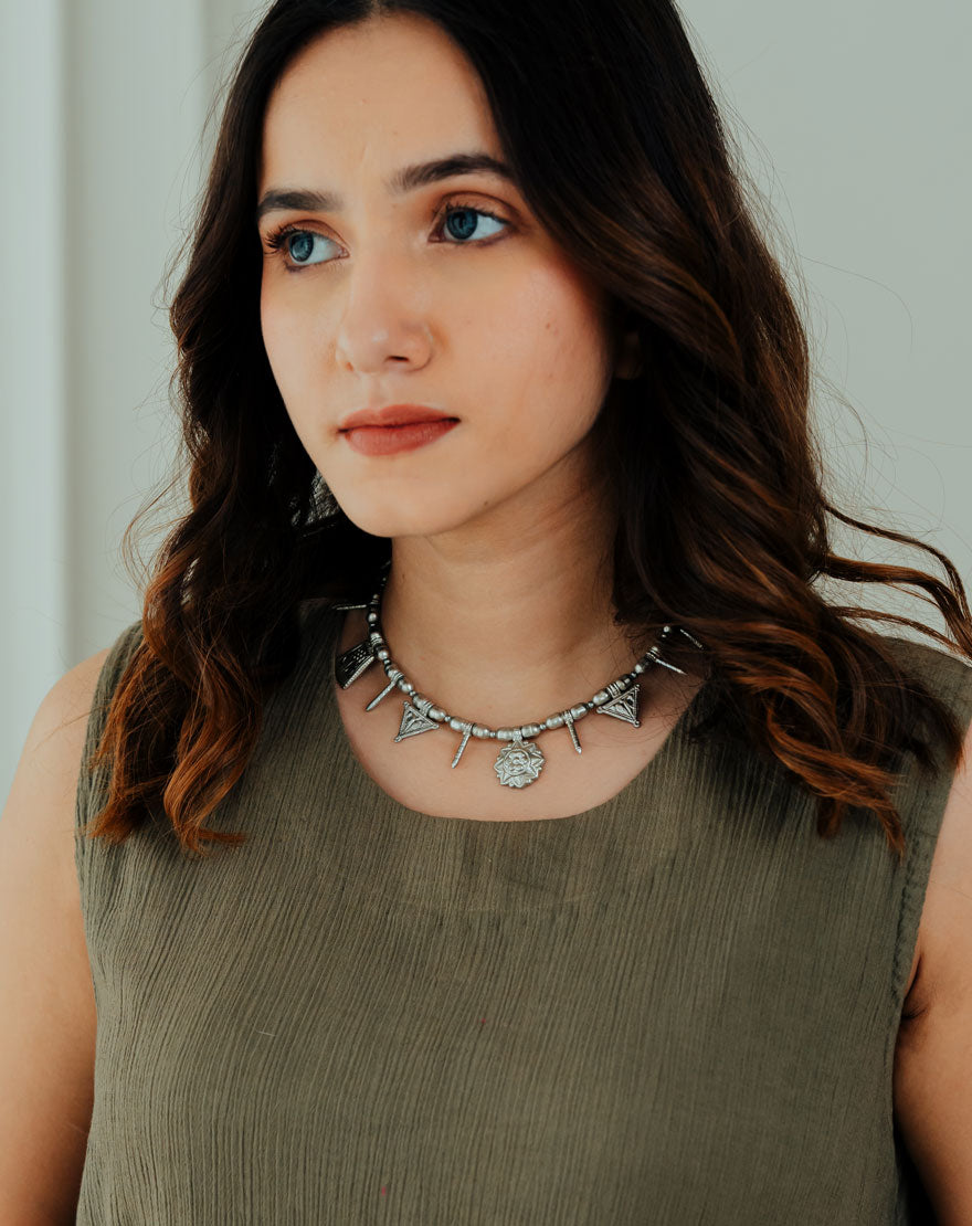 This statement making silver tribal necklace is inspired from different floral motifs painted on on Jaipur’s palace walls. This necklace is made on silver plated recycled brass. This necklace has a thread closure with a bead which can help in adjusting lengths.