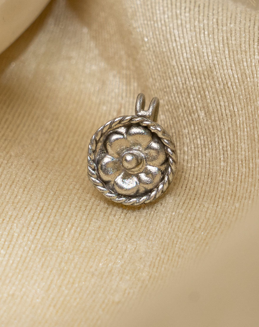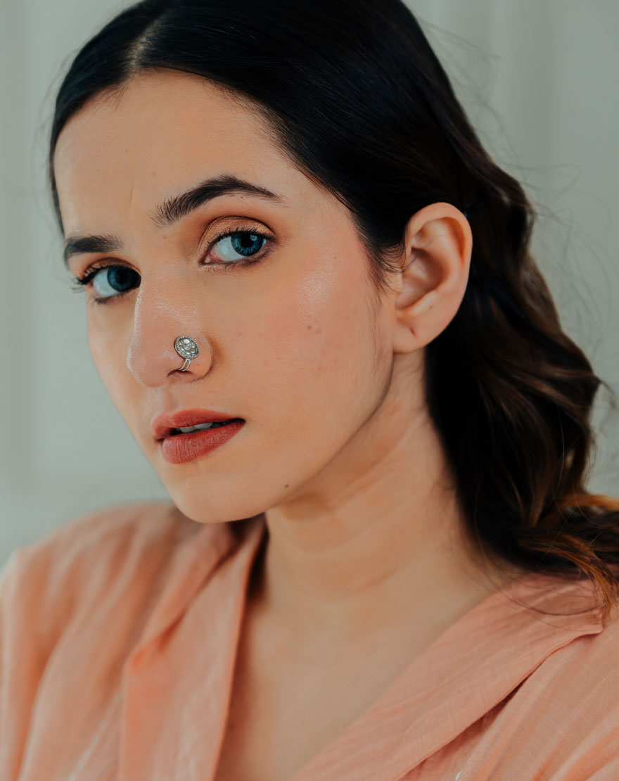 This beautiful press on Gul Nose Ring is handcrafted using silver plated recycled brass. This nose ring gives a subtle dramatic feel to your entire look. Perfect for festive wear.
