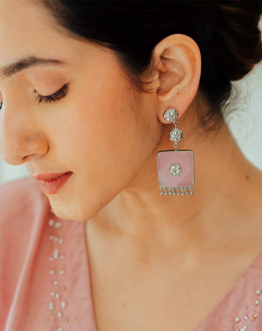 These beautiful Gulaabi Earrings are handcrafted using natural Rose Quartz stones with silver plated floral motifs and ghunghroos. These earrings are light in weight and statement making. Perfect for Indowestern looks.
