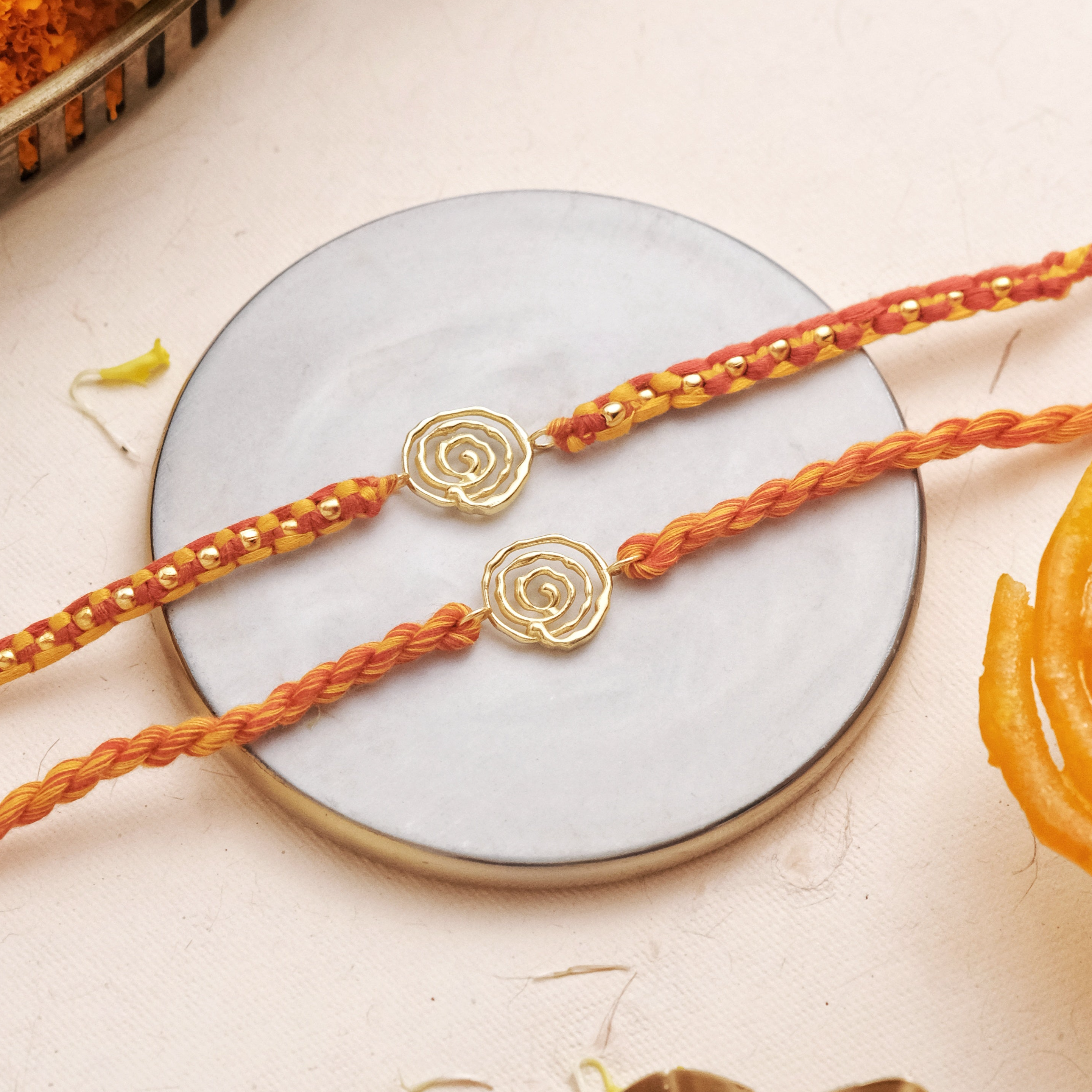 For Brother : Handcrafted using 18k gold dipped jalebi motif with hand braided organic cotton thread bands