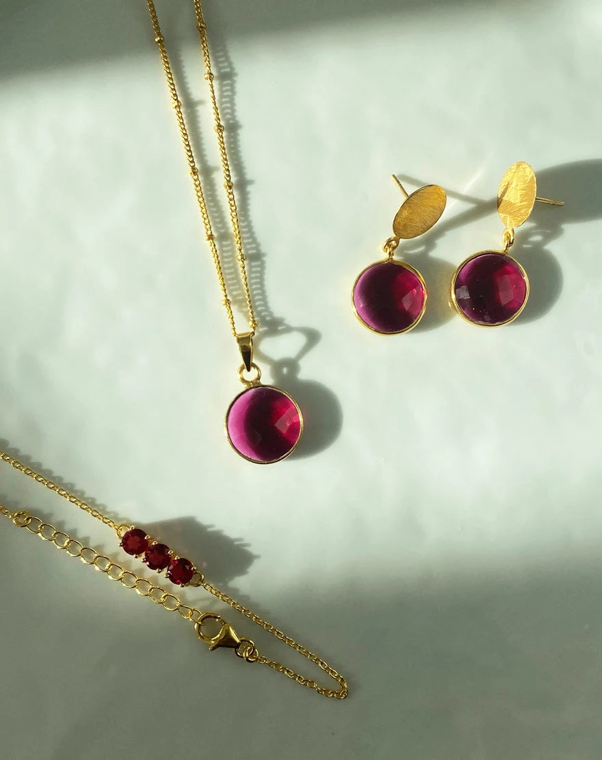 This beautiful combo of Anastasia collection of Necklace + earrings + bracelet handmade using Ruby Hydro birthstone, 18k gold plated 925 silver which will make a perfect gift for your loved one or just for yourself.