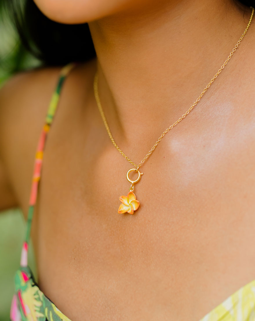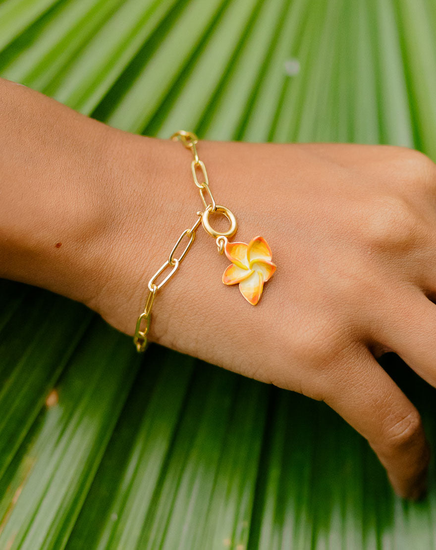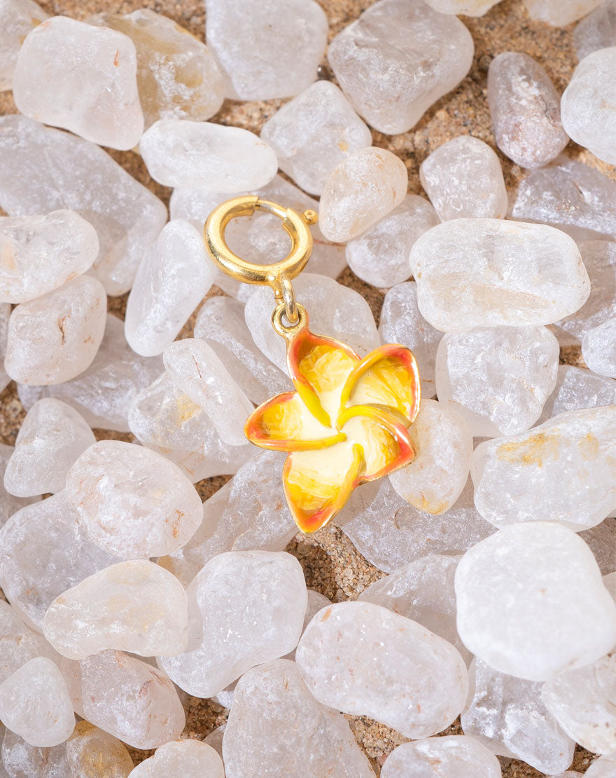 Leilani means heavenly flower in Hawaiian language. This charm is inspired from Plumeria flower which are found widely in Hawaii. They have the sweetest fragrance with gorgeous shades. This charm is handcrafted using 18k gold plated brass and are hand painted with the colors as seen on plumeria flowers. You can slip this charm on simple cable chain, pearl link chain or a paper clip bracelet.