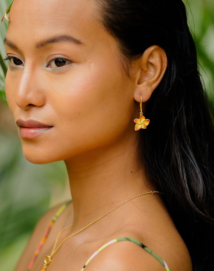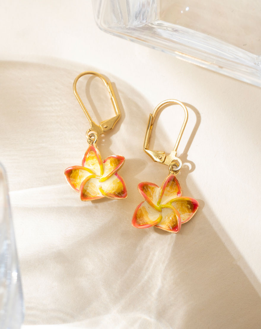 Leilani means heavenly flower in Hawaiian language. These earrings are inspired from Plumeria flower which are found widely in Hawaii. They have the sweetest fragrance with gorgeous shades. These earrings are handcrafted using 18k gold plated brass and are hand painted with the colors as seen on plumeria flowers.