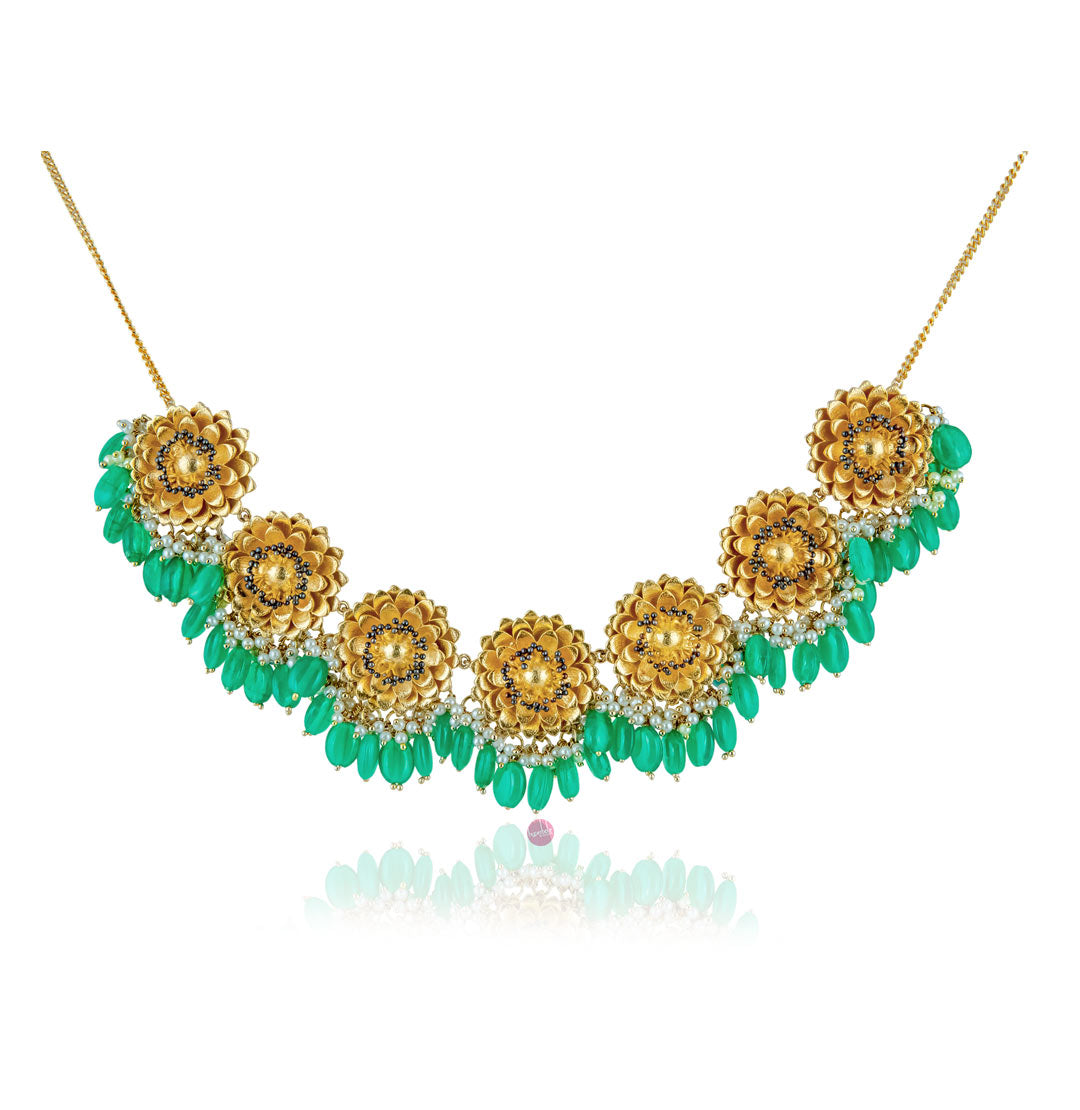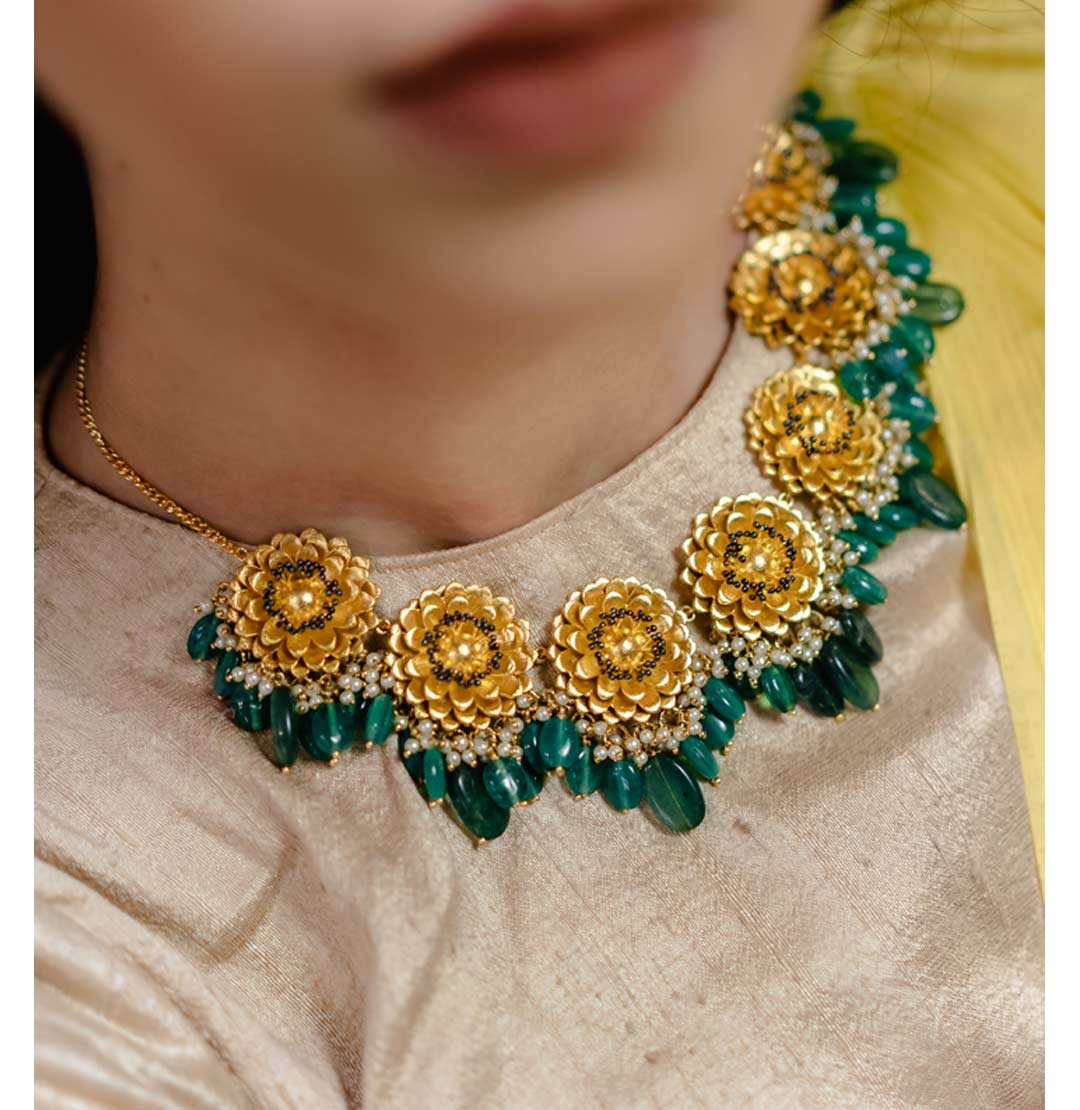 Marigold Choker – Emerald Green – Handcrafted statement making choker made using layers of metal just like in a marigold flower. With 1 micron gold plating and semiprecious Emerald Green bead and pearls.