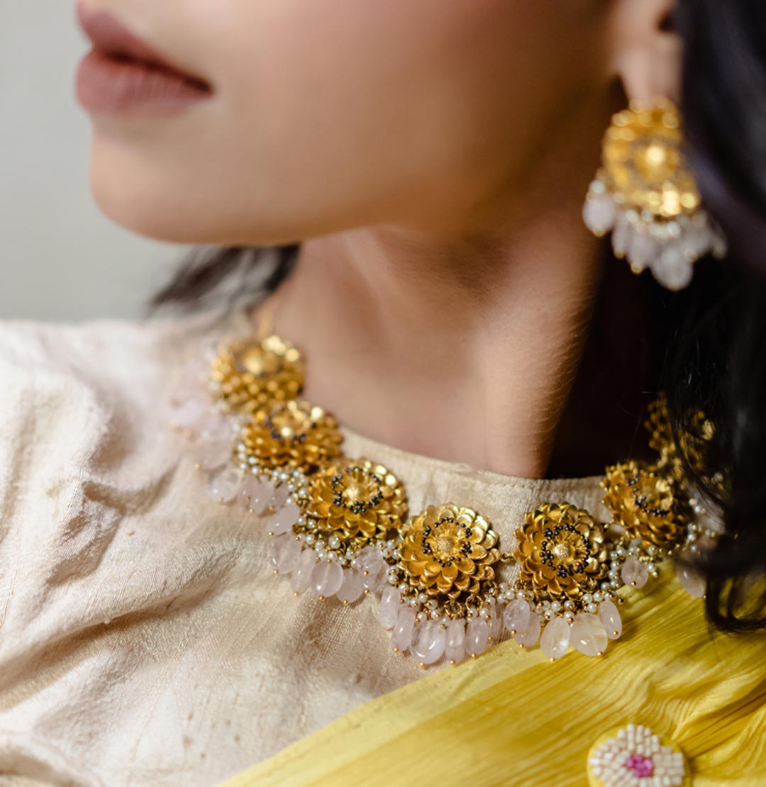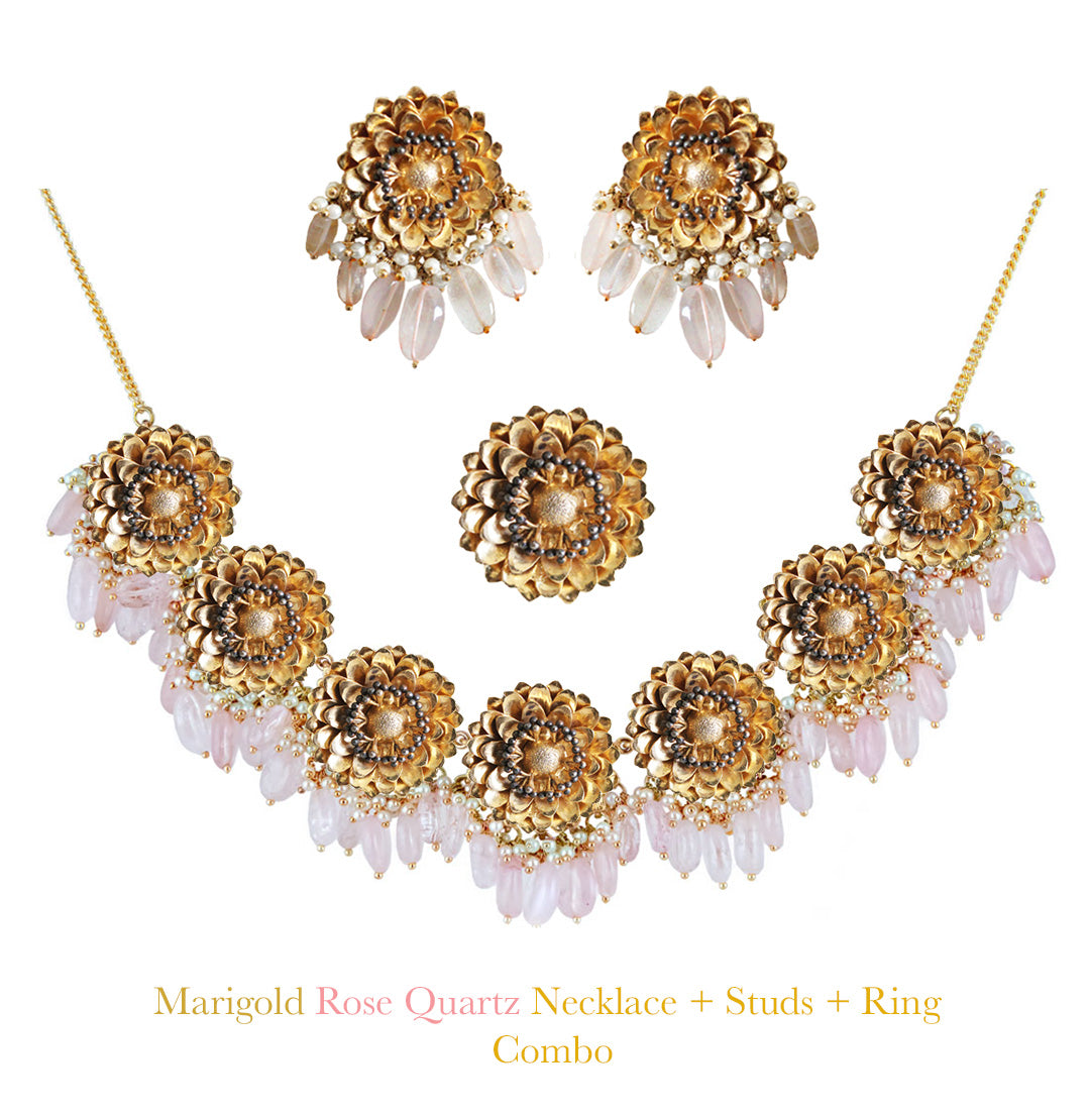 Marigold Rose Quartz Studs + Necklace + Ring Combo : Handcrafted earrings made using layers of metal just like in a marigold flower with quality 1 micron plating and detailing. Semiprecious Rose Quartz beads and pearls dangling to complete the silhouette with Marigold Ring and necklace, buy as a combo and get at discounted price.