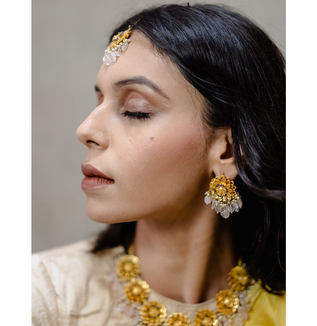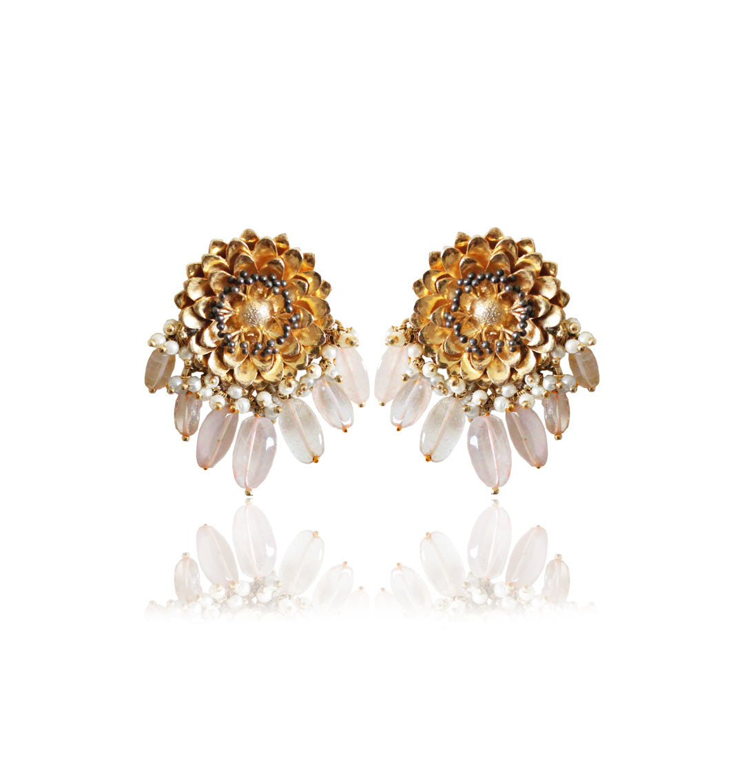 Marigold Studs – Rose Quartz – Handcrafted earrings made using layers of metal just like in a marigold flower with quality 1 micron plating and detailing. Semiprecious Rose Quartz beads and pearls dangling to complete the silhouette.