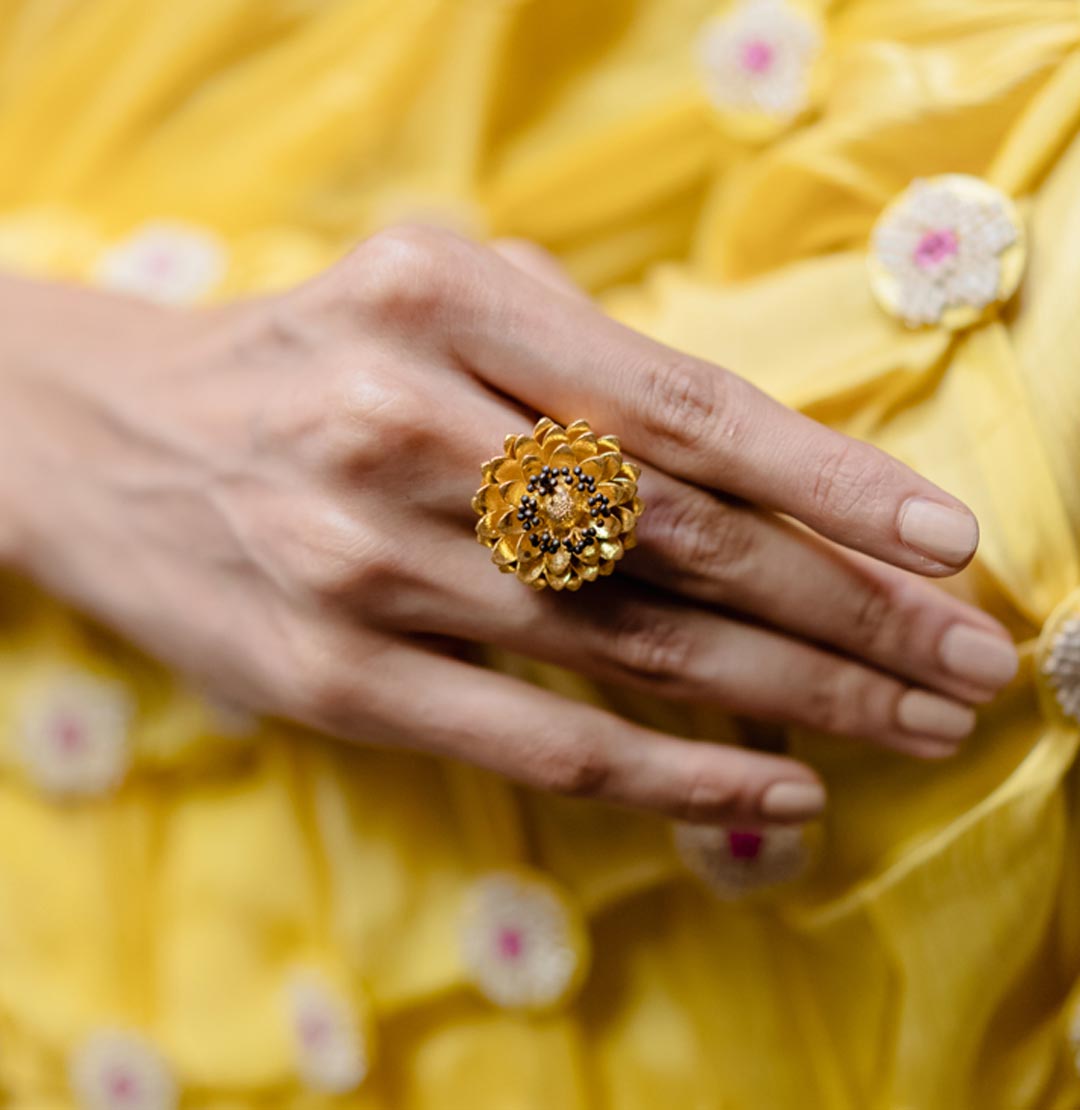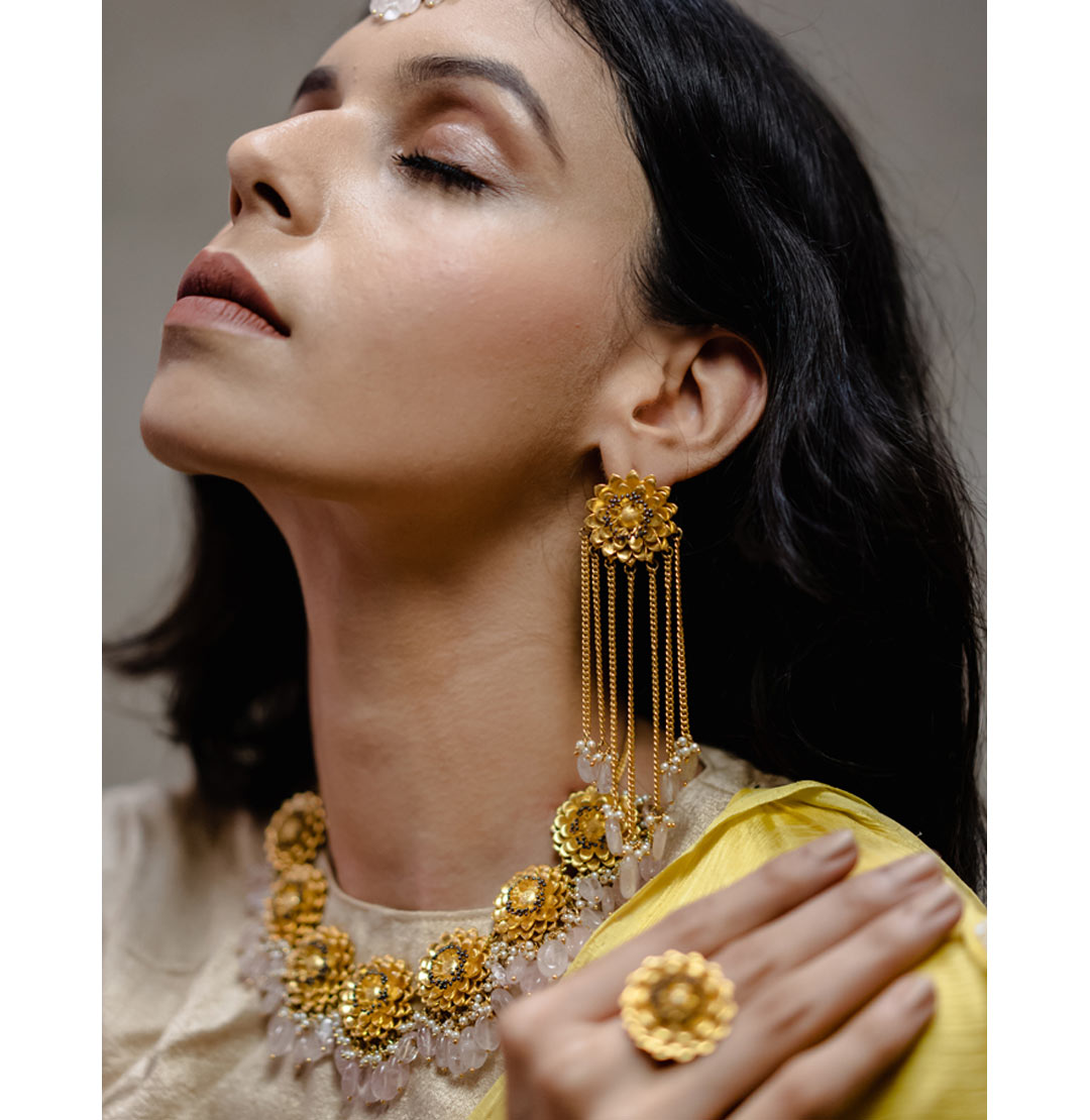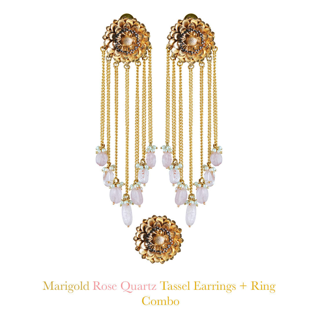 Marigold Tassel Earrings and Ring Combo : Handcrafted earrings made using layers of metal just like in a marigold flower with quality 1 micron plating and tassels. Semiprecious Rose Quartz beads and pearls dangling to complete the beautiful earrings with Marigold Ring , buy as a combo and get at discounted price.