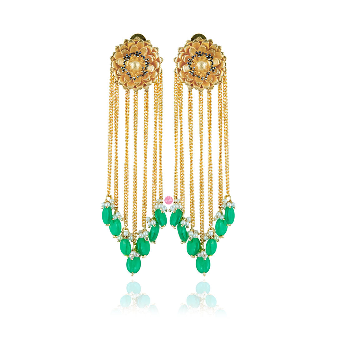 Marigold Tassels Emerald Green : Handcrafted earrings made using layers of metal just like in a marigold flower with quality 1 micron plating and tassels. Semiprecious Emerald Agate beads and pearls dangling to complete the beautiful earrings.