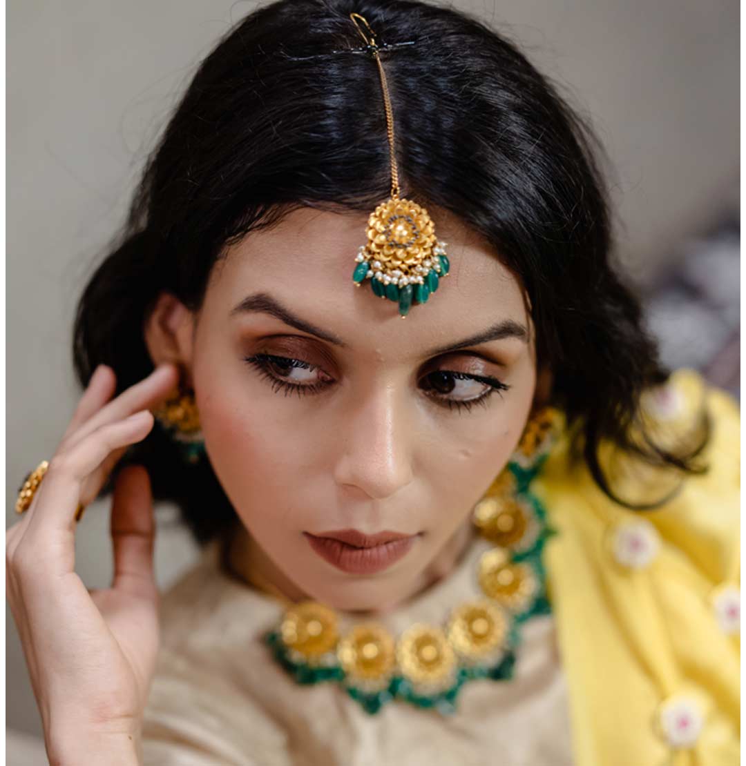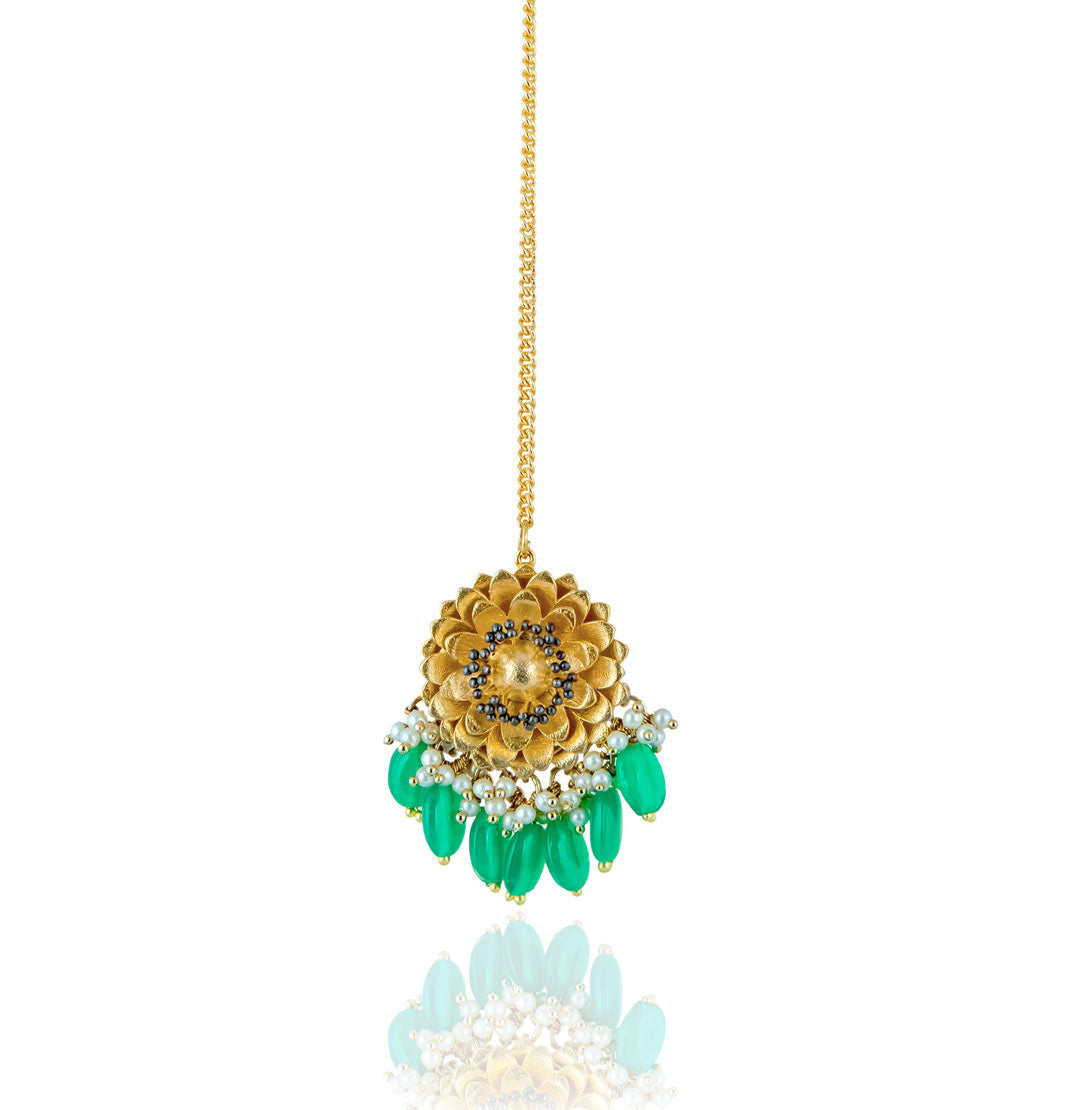 Marigold Tika – Emerald Green – Beautiful handcrafted tika made out of different layers of metal just as in the marigold flower. In 1 micron gold plating with Emerald Green beads and pearls.