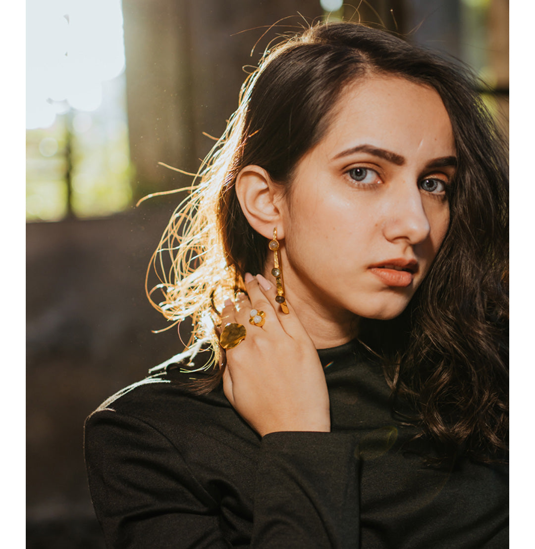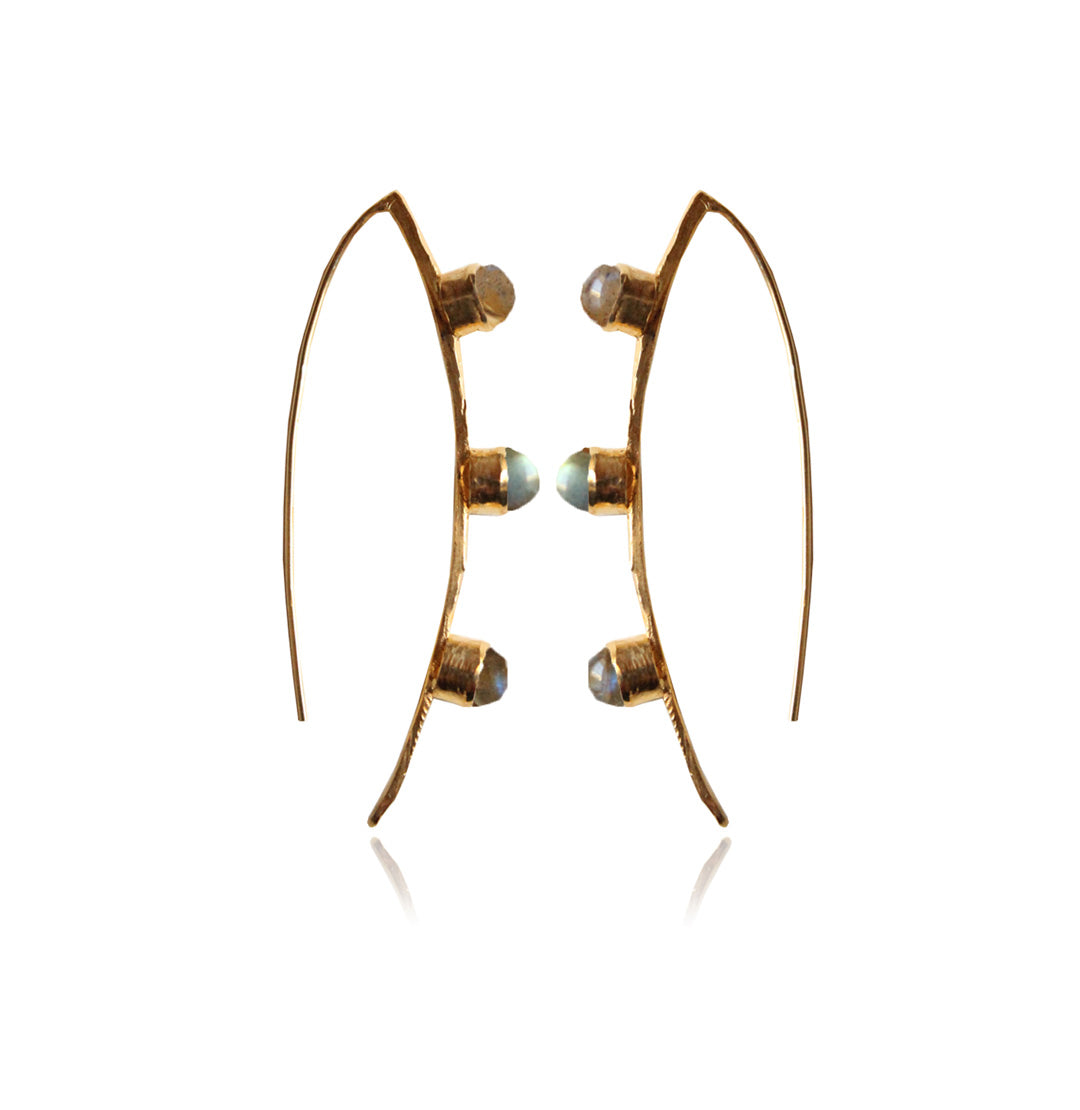 Nadya Earrings Labradorite – Handcrafted Earrings which are statement and sleek studded with beautiful semiprecious stones such as labradorite in gold plated brass.