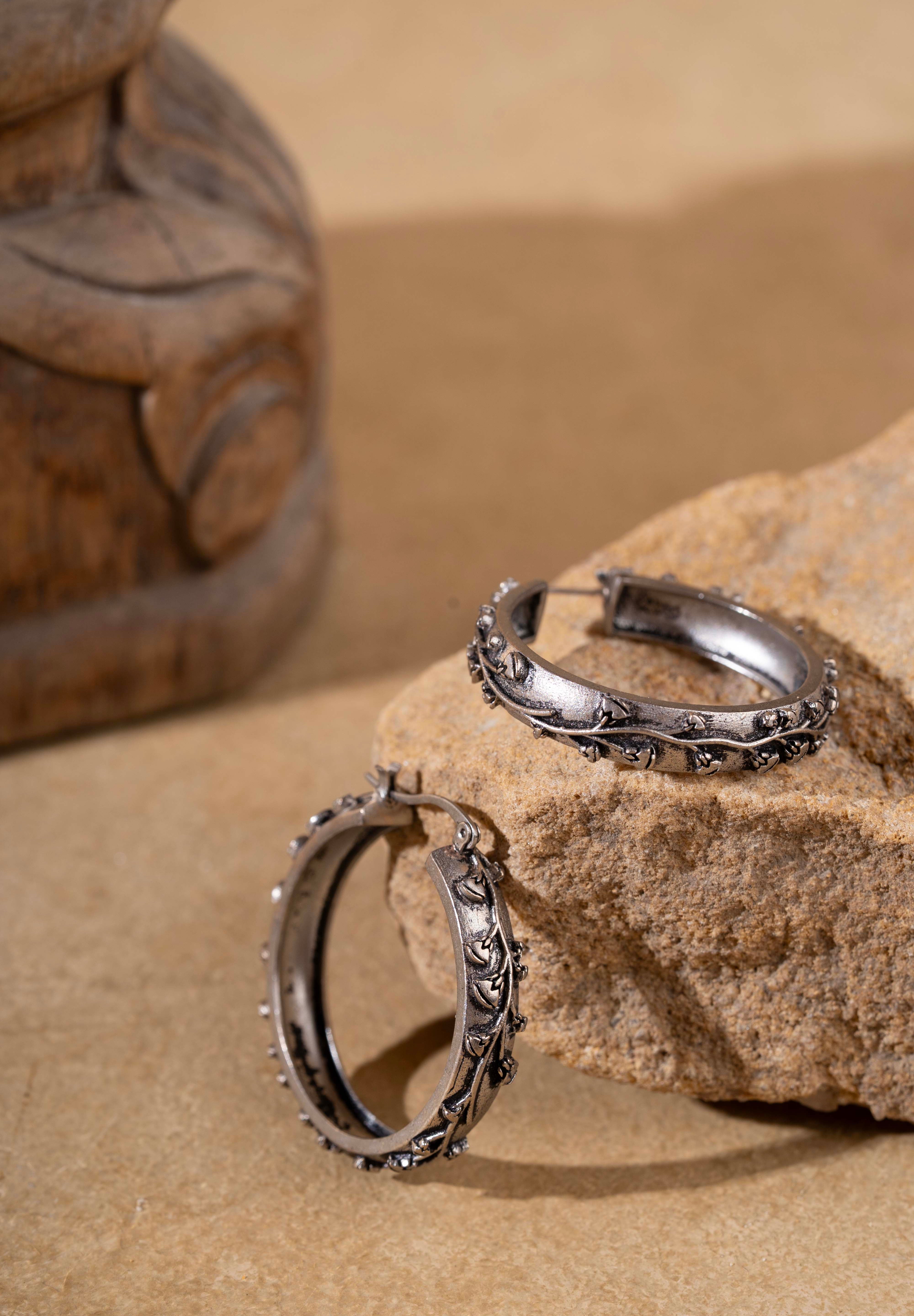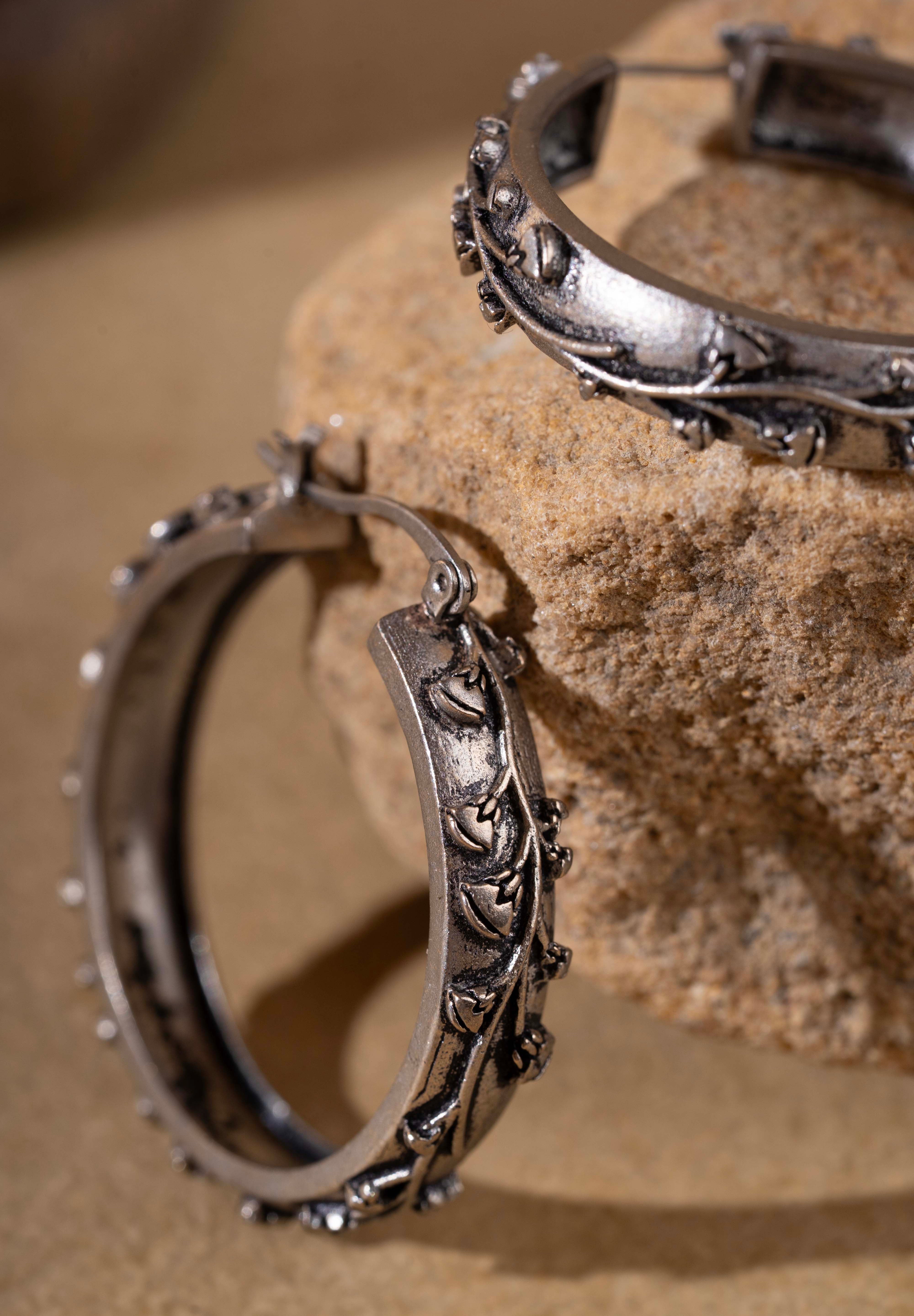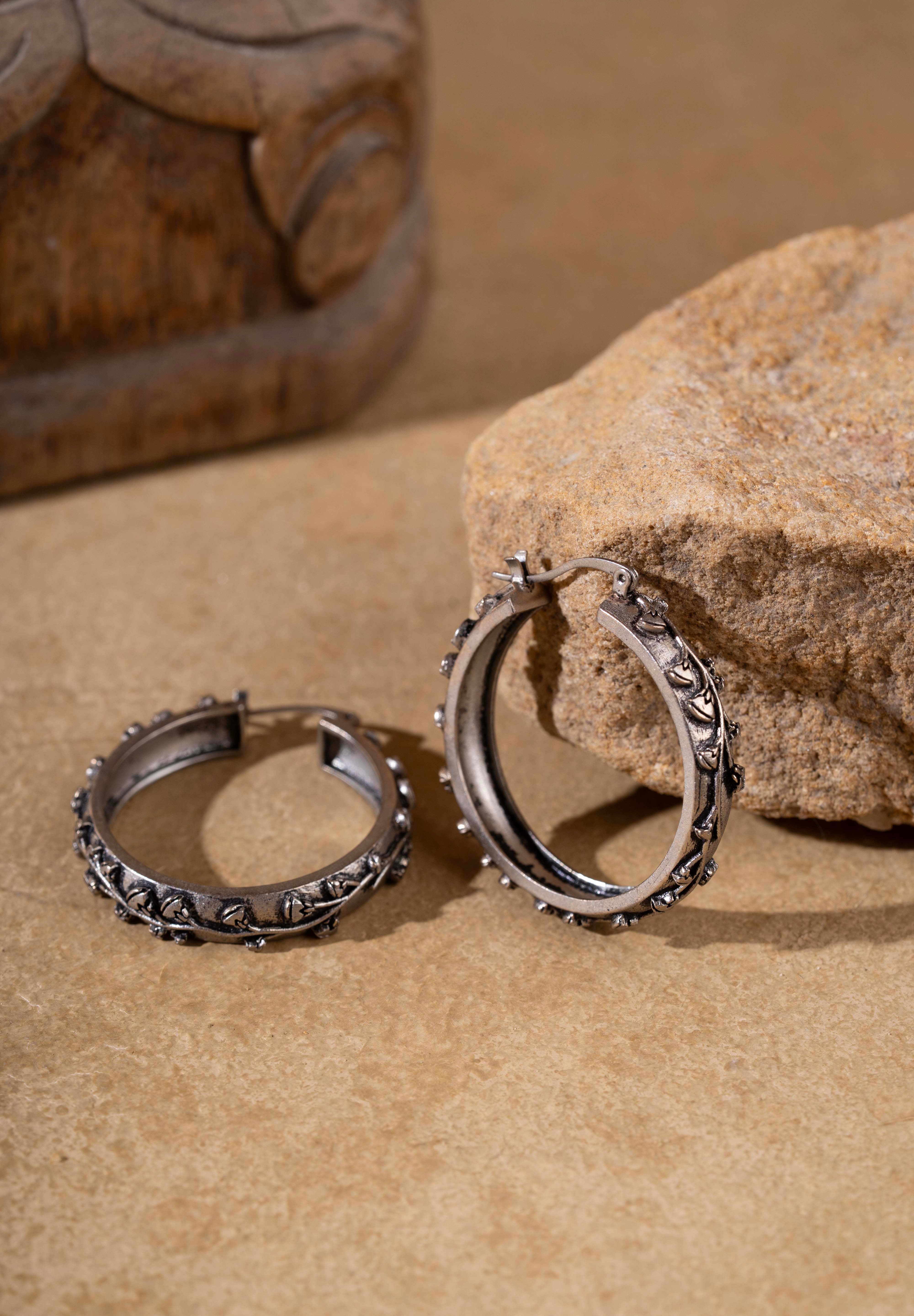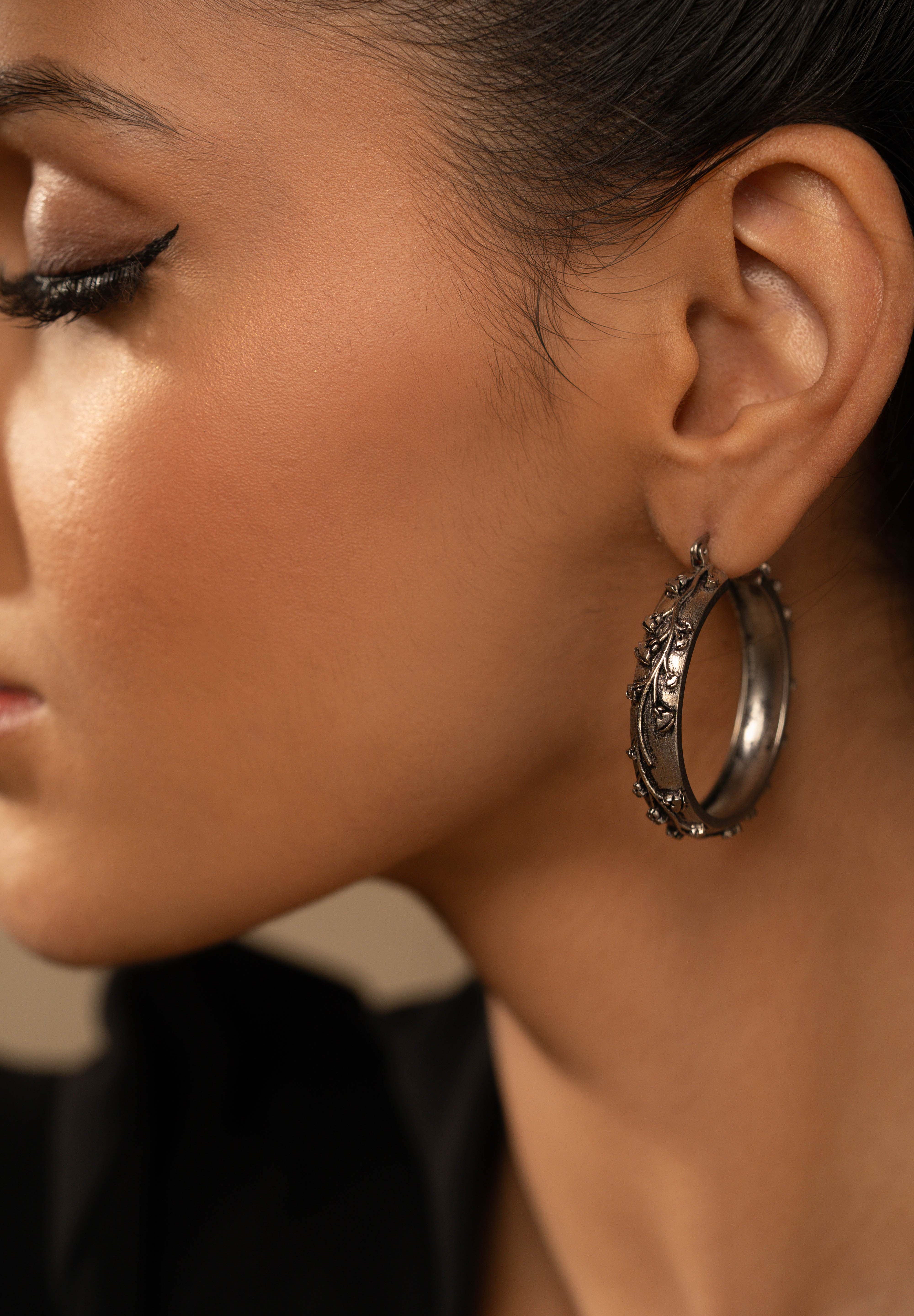 Inspired by the divine lotus of ancient Egypt, the Nefura Large Hoops celebrate renewal and beauty in sculptural form. Handcrafted in recycled brass with a silver-plated gunmetal finish, each hoop is adorned with intricately carved floral motifs that flow like a continuous vine. Bold yet graceful, these statement hoops embody the spirit of Egyptian artistry — strong, feminine, and timeless.