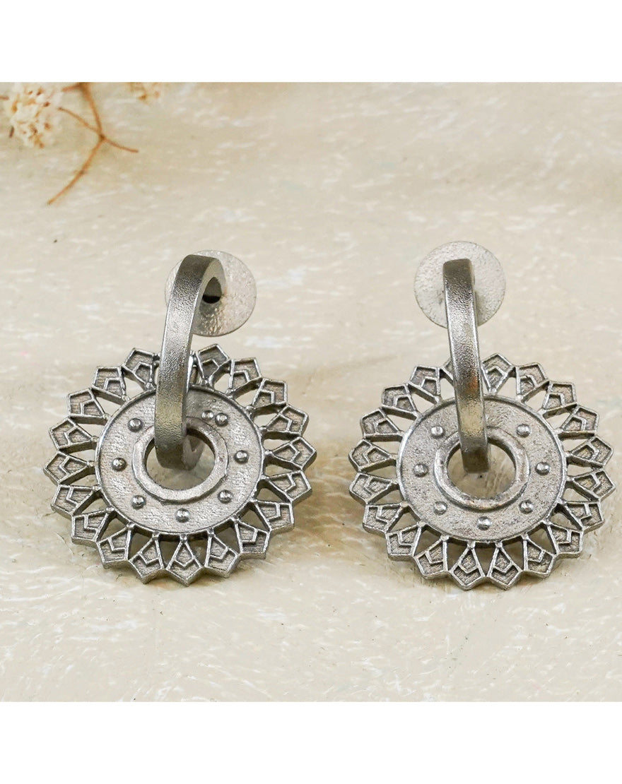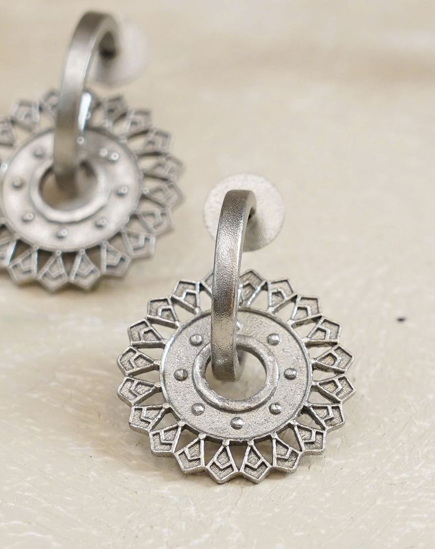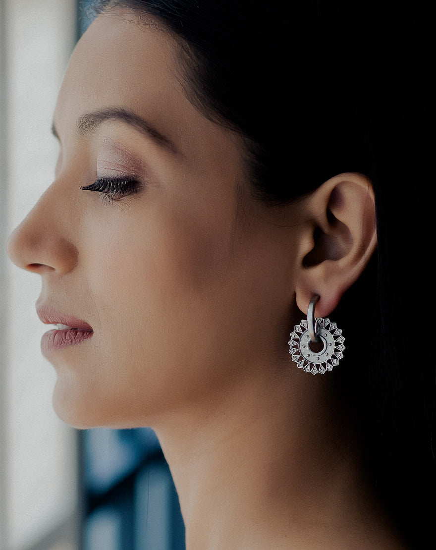 Nora Hoop Studs Silver – These stunning pair of Hoop earrings are inspired from the architectural patterns found in the city of Marrakech (Morocco) handcrafted using silver plated brass. These earrings are feather light in weight and a perfect pair of Indian Contemporary style.