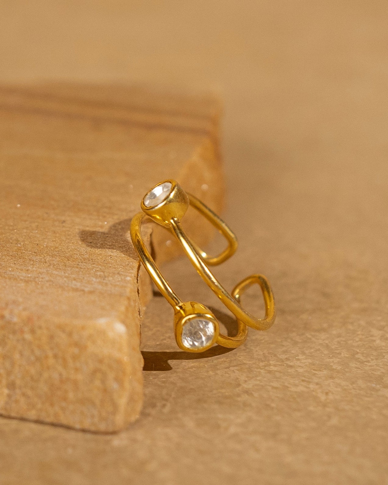 Sleek, sculptural, and endlessly wearable — the Orbit Ring is a study in balance and brilliance. Crafted with two parallel bands that curve around the finger, it features two bezel-set uncut moissanite stones that feel as though they’re suspended in orbit.