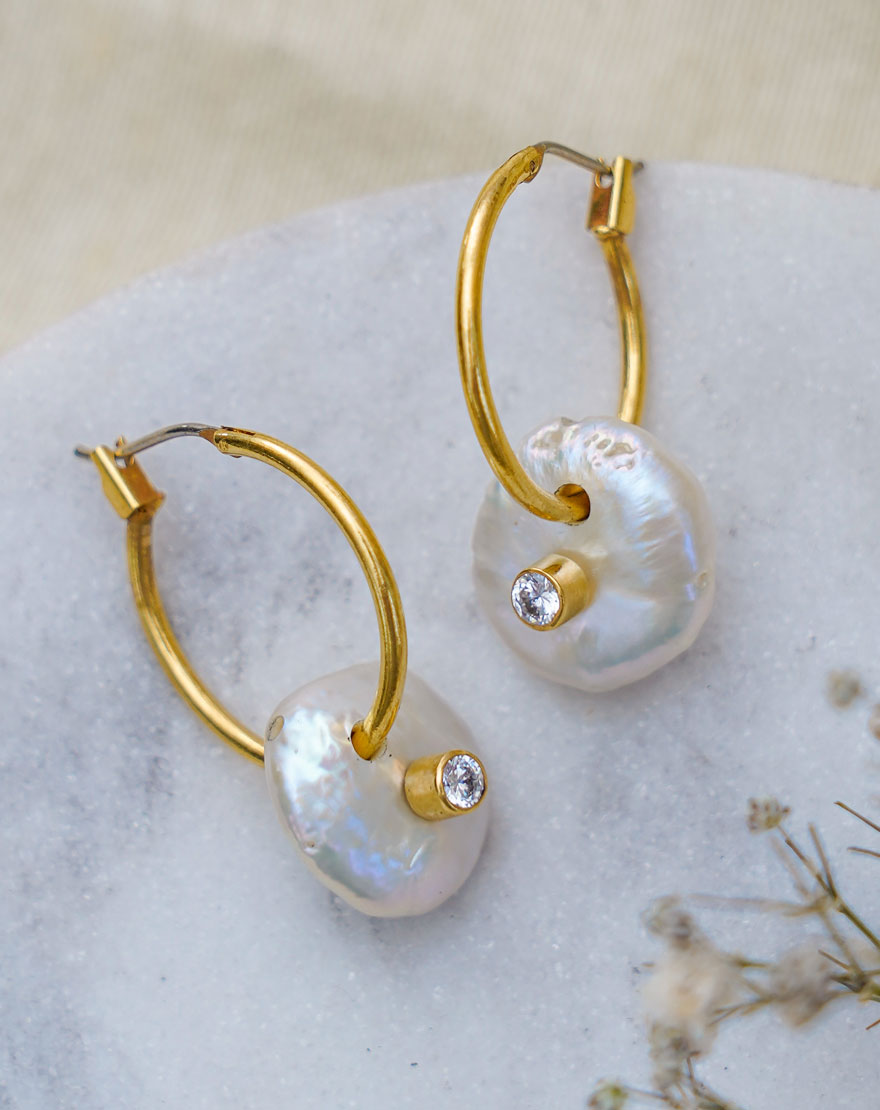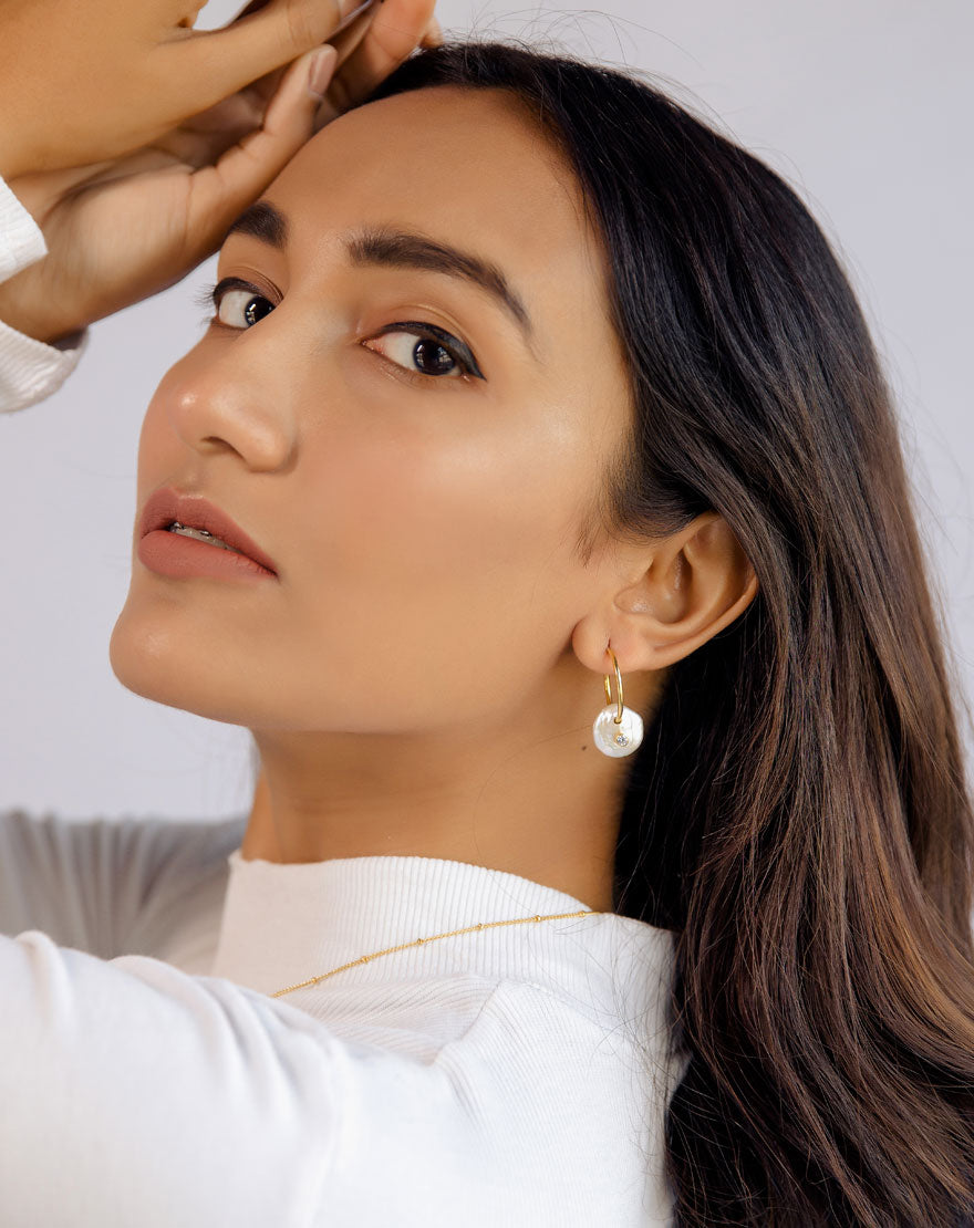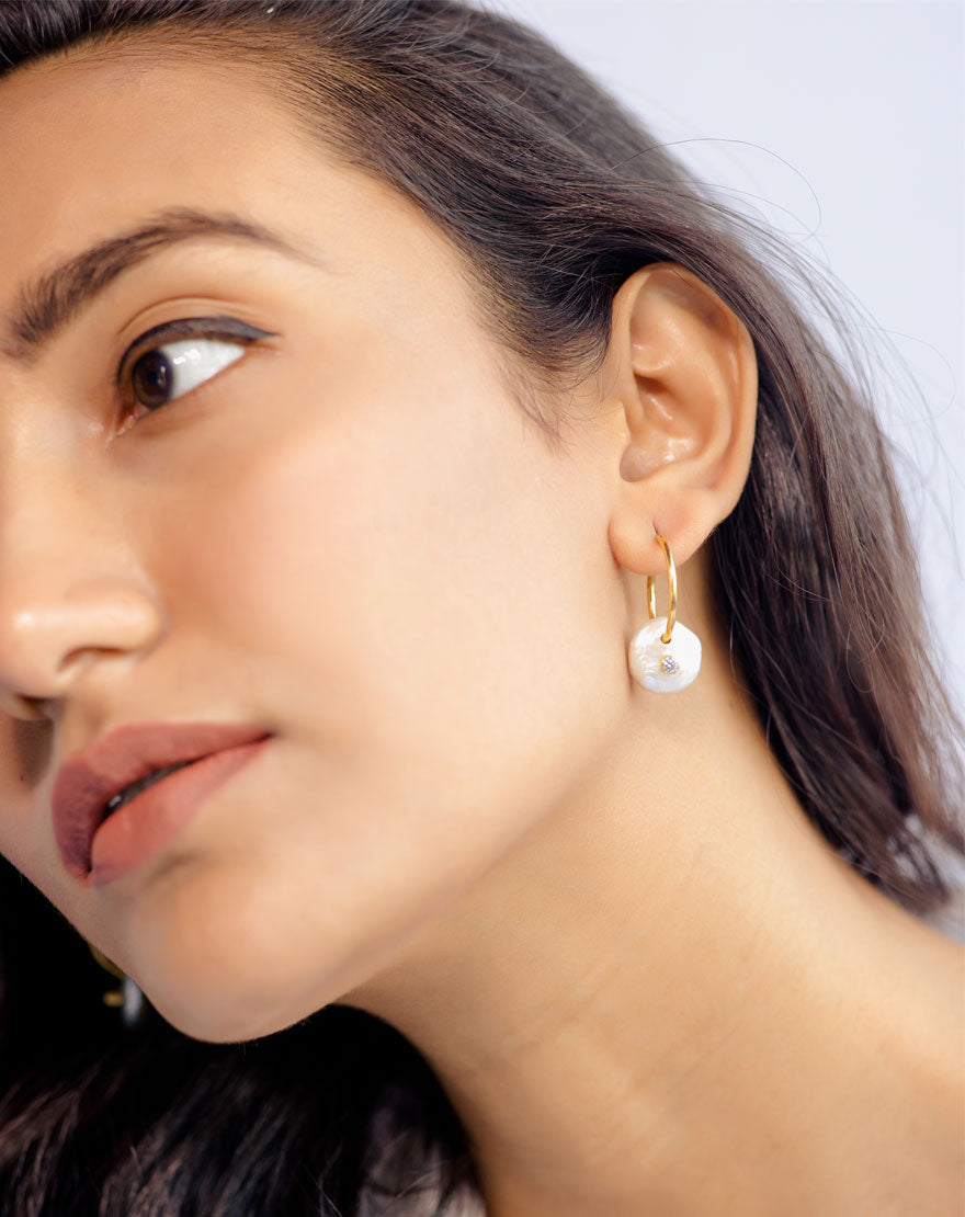Paloma Hoops redefines elegance! Handcrafted using recycled brass on 18k gold plating with button pearls and CZ studded in it. Perfect for workwear, day wear or for brunch look.