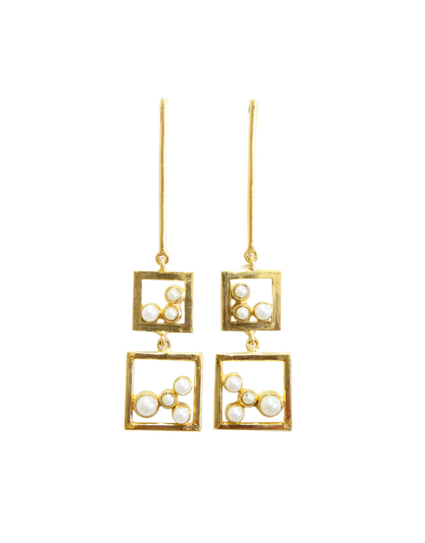 Statement making danglers handcrafted using pearls and good quality gold plated brass, playing with form and space to give a classic and minimal look