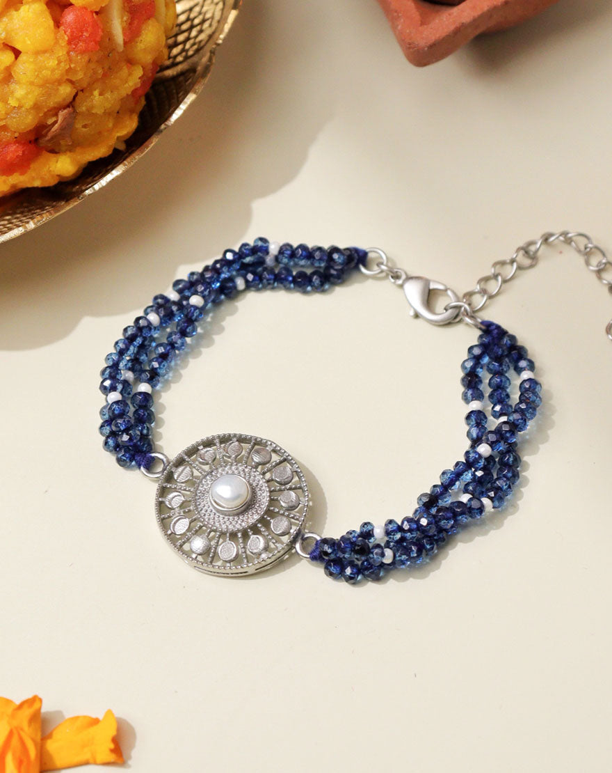 This beautiful bracelet is inspired from the Phases of Moon concept which signifies wisdom, intuition and rhythm of life within us. Handcrafted using silver plated brass with pearl, blue glass beads and pearl beads.