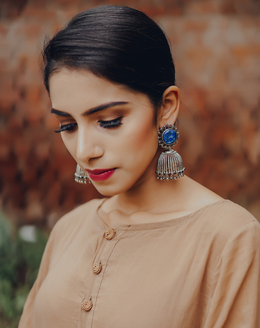 Pinjra Earrings – Lapis Lazuli : These are from Silver Bloom Collection. Handcrafted statement jhumkas using silver plated brass with lapis Lazuli stone, intricate details and crafted to perfection.