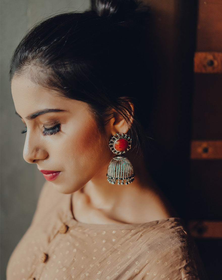 Pinjra Earrings – Red Carnelian : These are from Silver Bloom Collection. Handcrafted statement jhumkas using silver plated brass with red carnelian stone, intricate details and crafted to perfection.